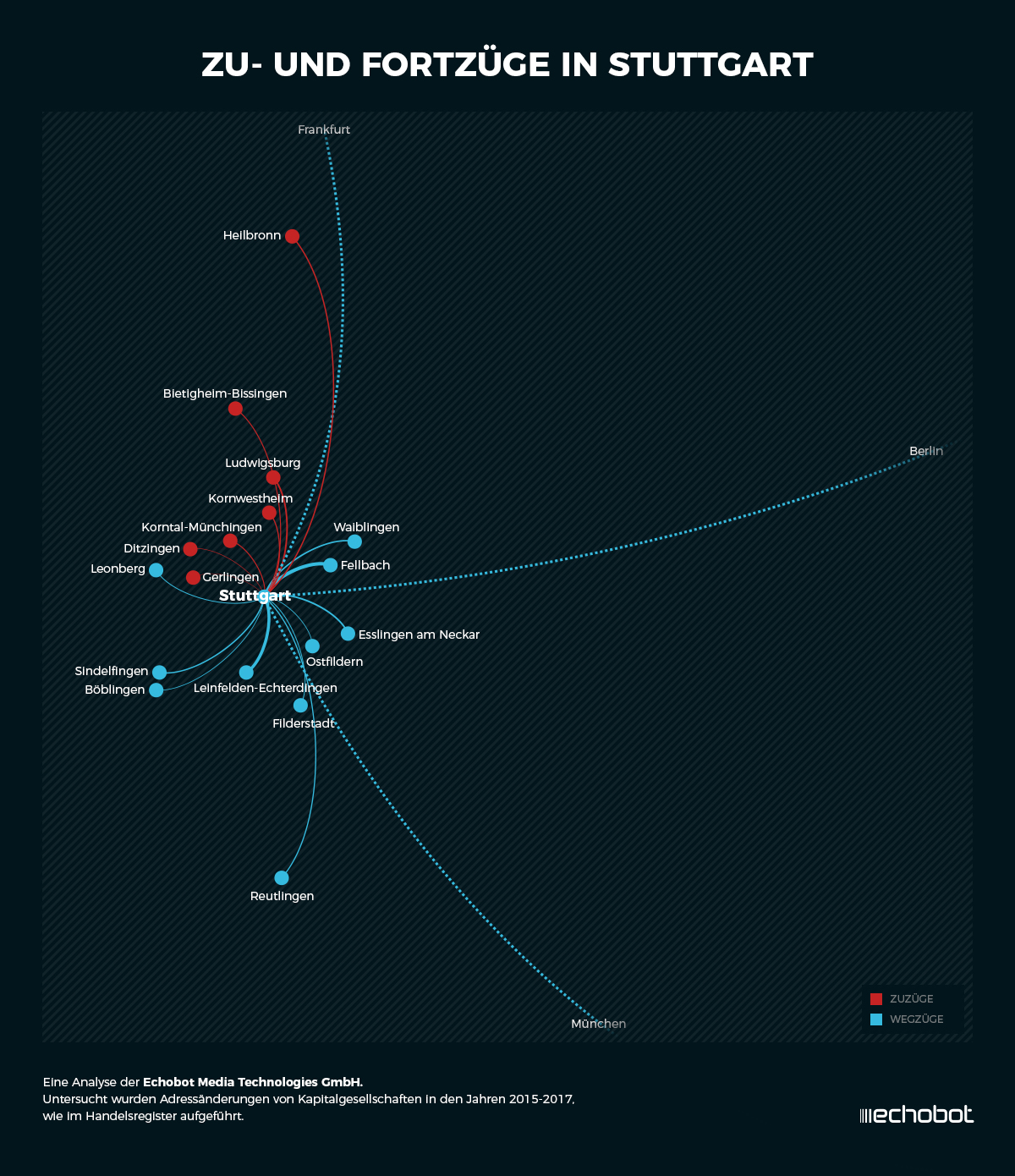 Am Beispiel der Stadt Stuttgart ist deutlich zu erkennen, dass die meisten Bewegungen aus der Stadt ins nähere Umland stattfinden (Die Grafik zeigt die Zuzüge in rot und die Fortzüge in blau). Die beliebtesten Standorte sind hier Fellbach und Leinfelden-Echterdingen. Der Forschungsleiter Dr. Matthias Keller sieht zwei mögliche Gründe, warum Firmen der Stadt den Rücken kehren: „Die Gründe für einen Wegzug müssen nicht extern sein, also in einer sinkenden Attraktivität der Stadt begründet liegen. Interne Ursachen, wie Wachstum und steigender Bedarf an Räumlichkeiten sind ebenso denkbar.“
