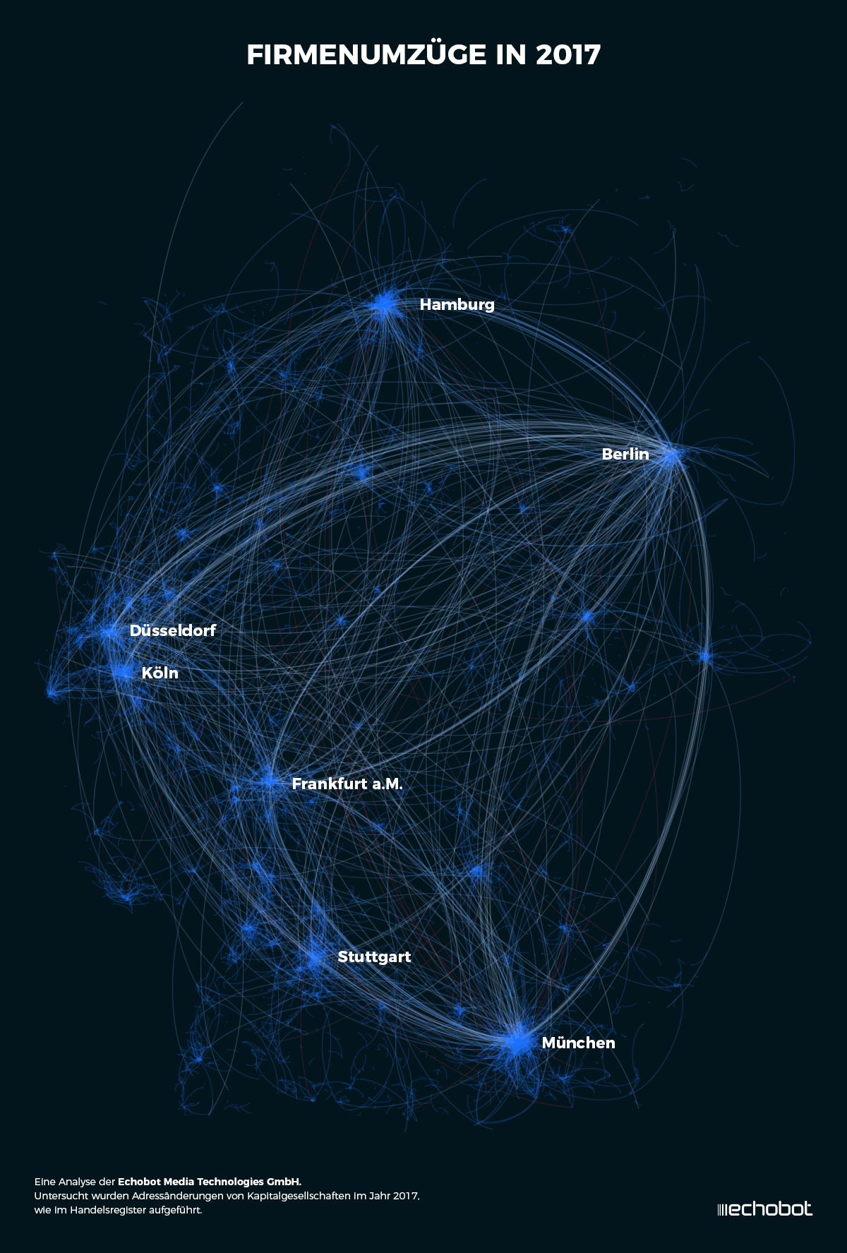 Deutschlandkarten gibt es in jeglicher Ausführung. – geographisch, politisch, historisch. Echobot interpretiert Deutschland mal anders und hat mit den vorhandenen Daten zu Firmenumzügen im letzten Jahr eine Karte allein aus Umzugsbewegungen erstellt.
