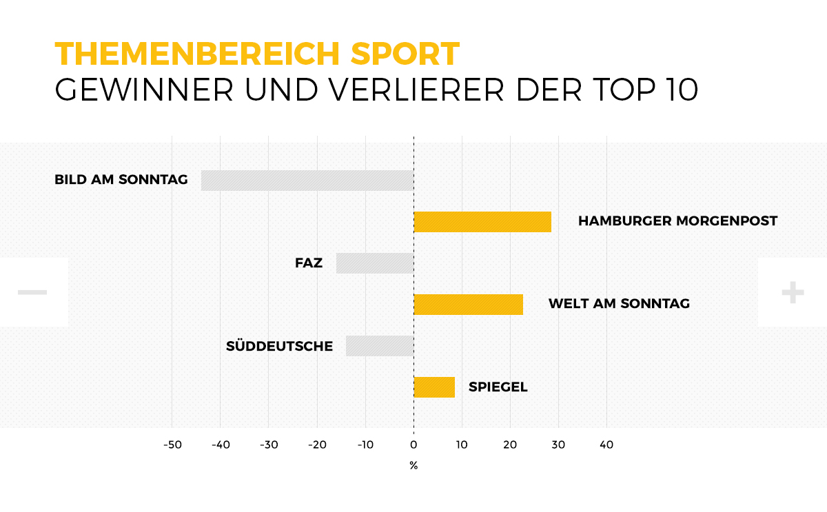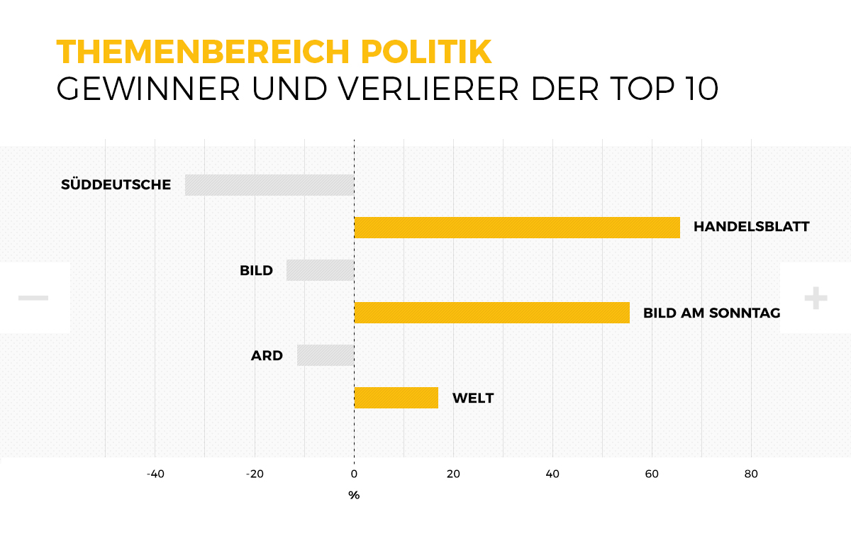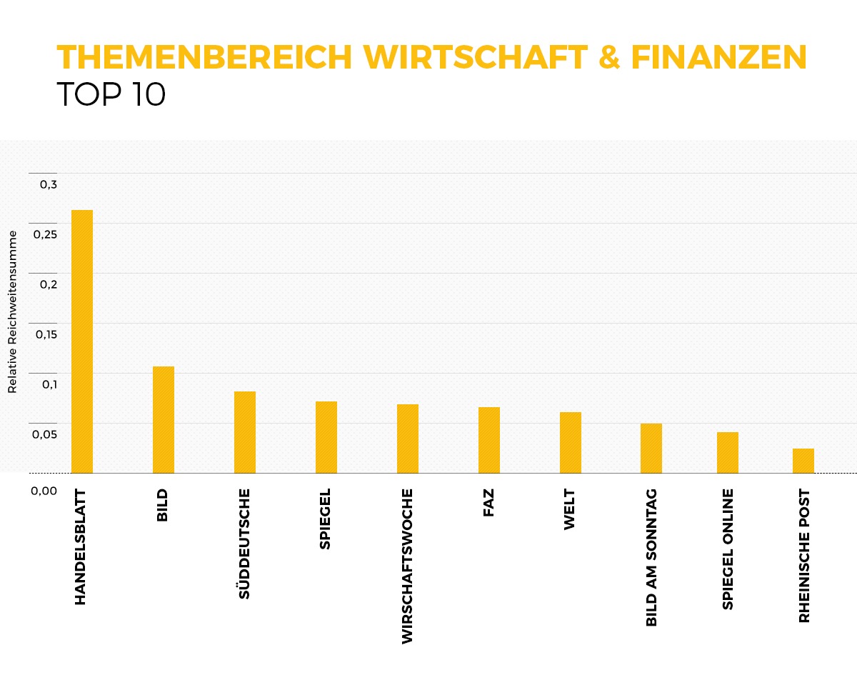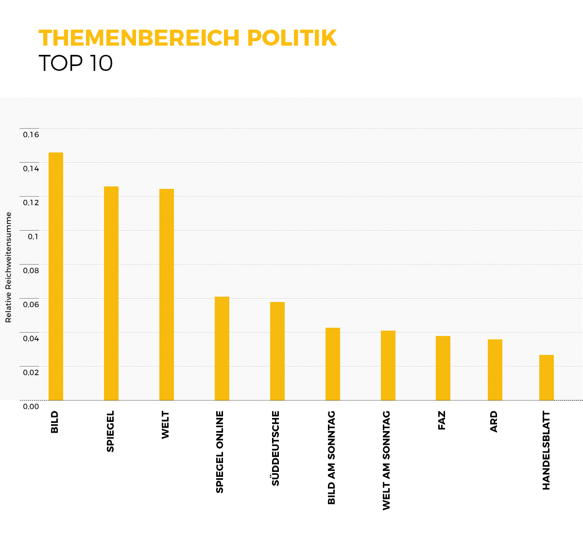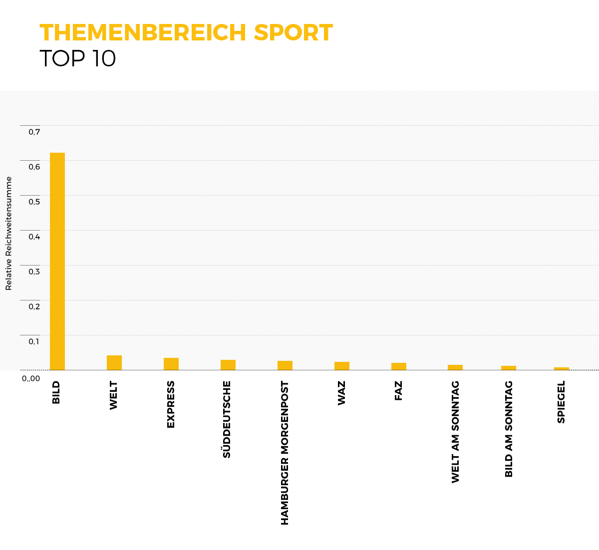 Die Dominanz der Bild-Zeitung wird besonders im Themenbereich Sport deutlich. Auf sie entfallen über 60 Prozent aller gefundenen Zitate. Gerade für die politische Meinungsbildung besonders wichtige Themenbereiche werden erfreulicherweise weniger stark von einem einzigen Medium dominiert: Im Bereich Politik teilt sich die Bild die Spitzenplätze mit dem Spiegel und der Welt. Im Vergleich zum Vorjahr verliert das Boulevard-Blatt sogar 14%. Bei Wirtschafts- und Finanzthemen liegt das Handelsblatt deutlich vor der Bild.