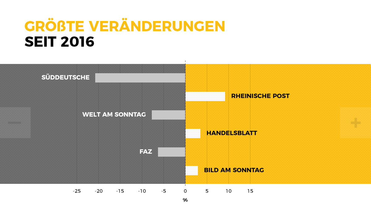 Im Gesamtranking 2017 ist die Bild-Zeitung mit Abstand der meistzitierte Print-Titel in den Online-Medien. Im Vergleich zu Studien mit Print-Schwerpunkt ist die Differenz zum Zweitplatzierten deutlich höher. So beträgt die Zitate-Reichweite der Bild-Zeitung fast das Vierfache des für den Spiegel berechneten Wertes. Hier zeichnet sich also eher ein Trend zur Konzentration der Meinungsführerschaft ab, als ein Trend zur Diversifikation und dem zunehmenden Einfluss kleinerer Medien. Ebenfalls ausgewertet wurden die relativen Veränderungen der zehn meistzitierten Medien im Vergleich zum Vorjahr. Die größten relativen Verluste muss die Süddeutsche Zeitung hinnehmen (21%), während dem regionalen Blatt Rheinische Post das größte relative Plus (9%) gelingt.