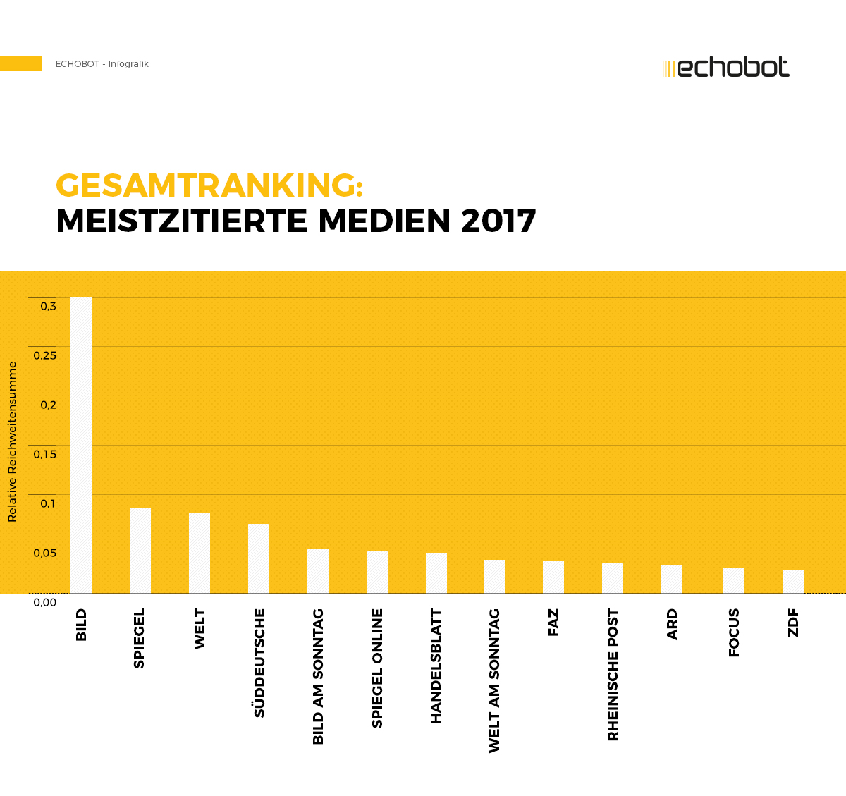 Für die Studie wurden über 50.000 Online-Quellen (Newsportale, Fachmagazine, Foren, Blogs sowie Presse- und Verbraucherportale) aus dem Echobot-Archiv mit einem automatisierten Verfahren nach Zitaten abgesucht. Als Zitate gewertet wurden Textpassagen, die eindeutig auf ein anderes Medium als Quelle verweisen („laut Spiegel Online“, „wie das Handelsblatt berichtet“). Für den Zeitraum 2016-2017 wurden insgesamt 900.000 deutschsprachige Zitate gefunden – diese wurden für das Ranking mit einer Schätzung der jeweiligen Reichweite des Artikels / Beitrags gewichtet.