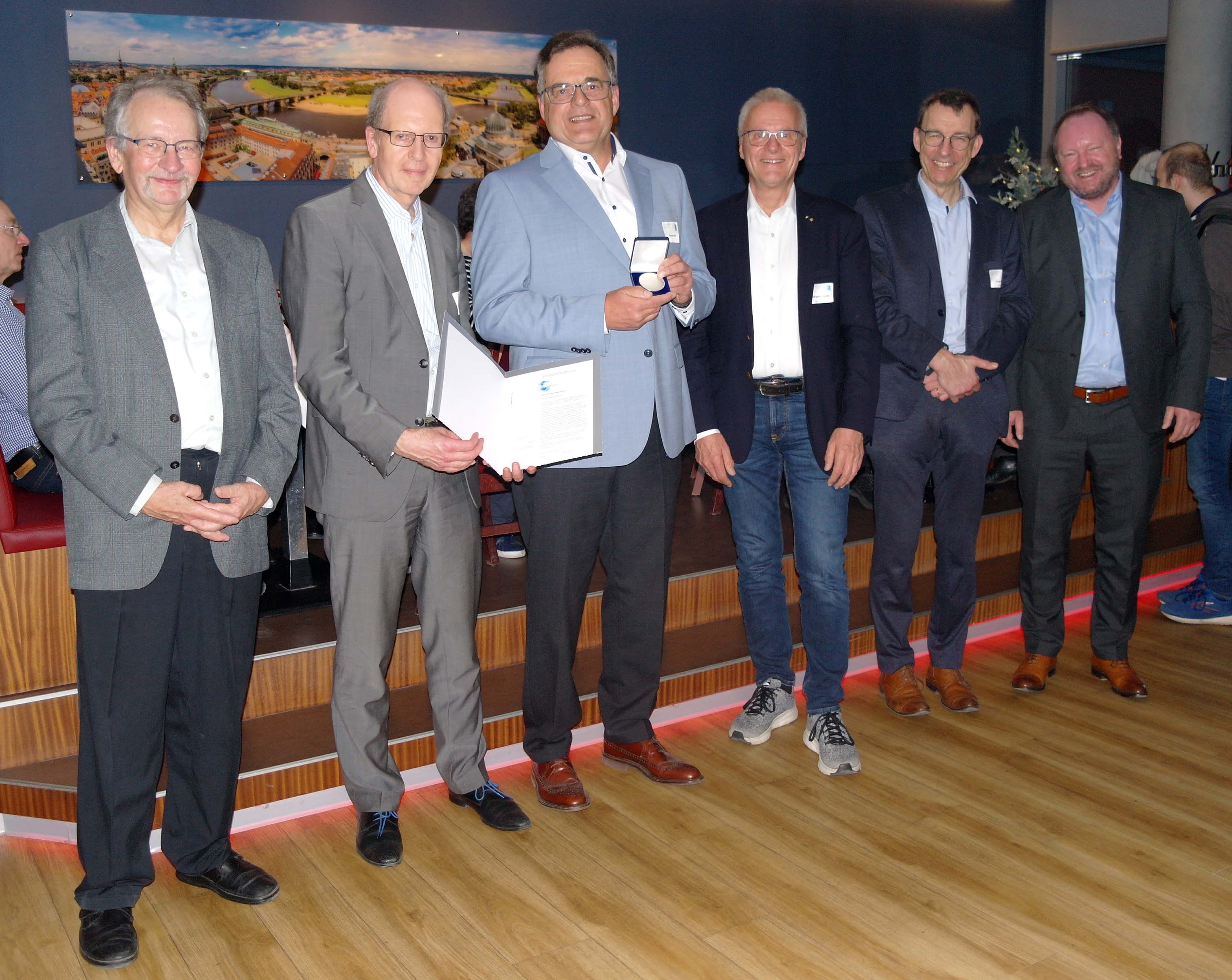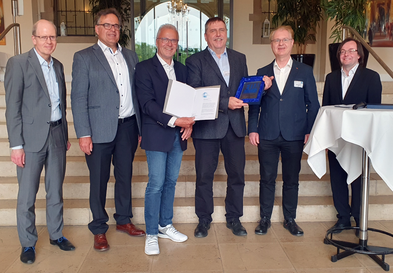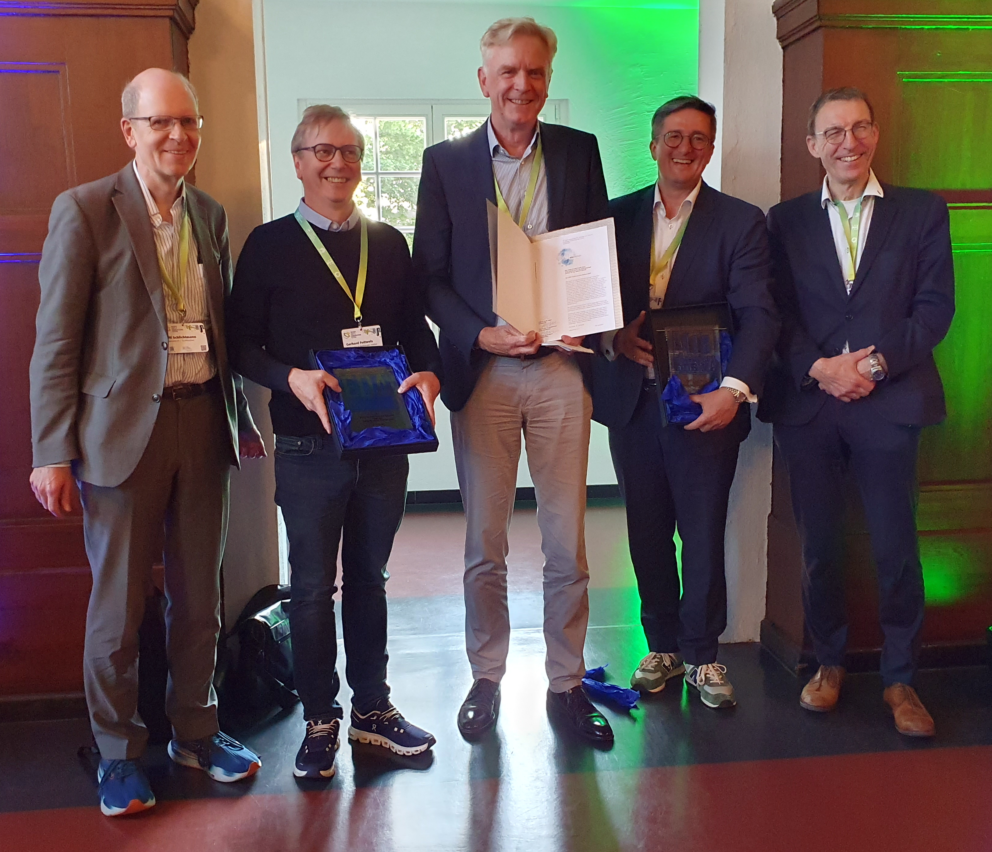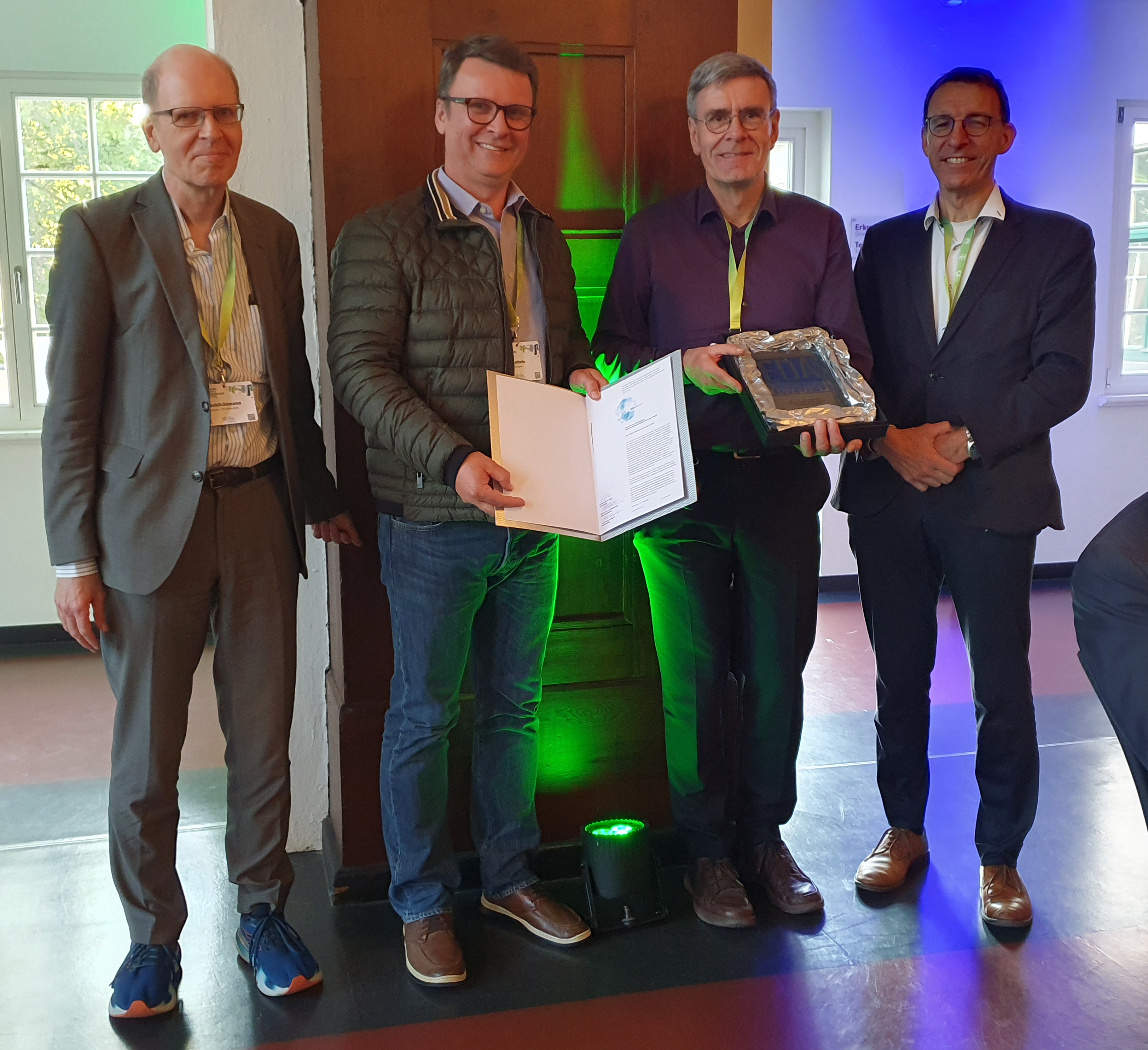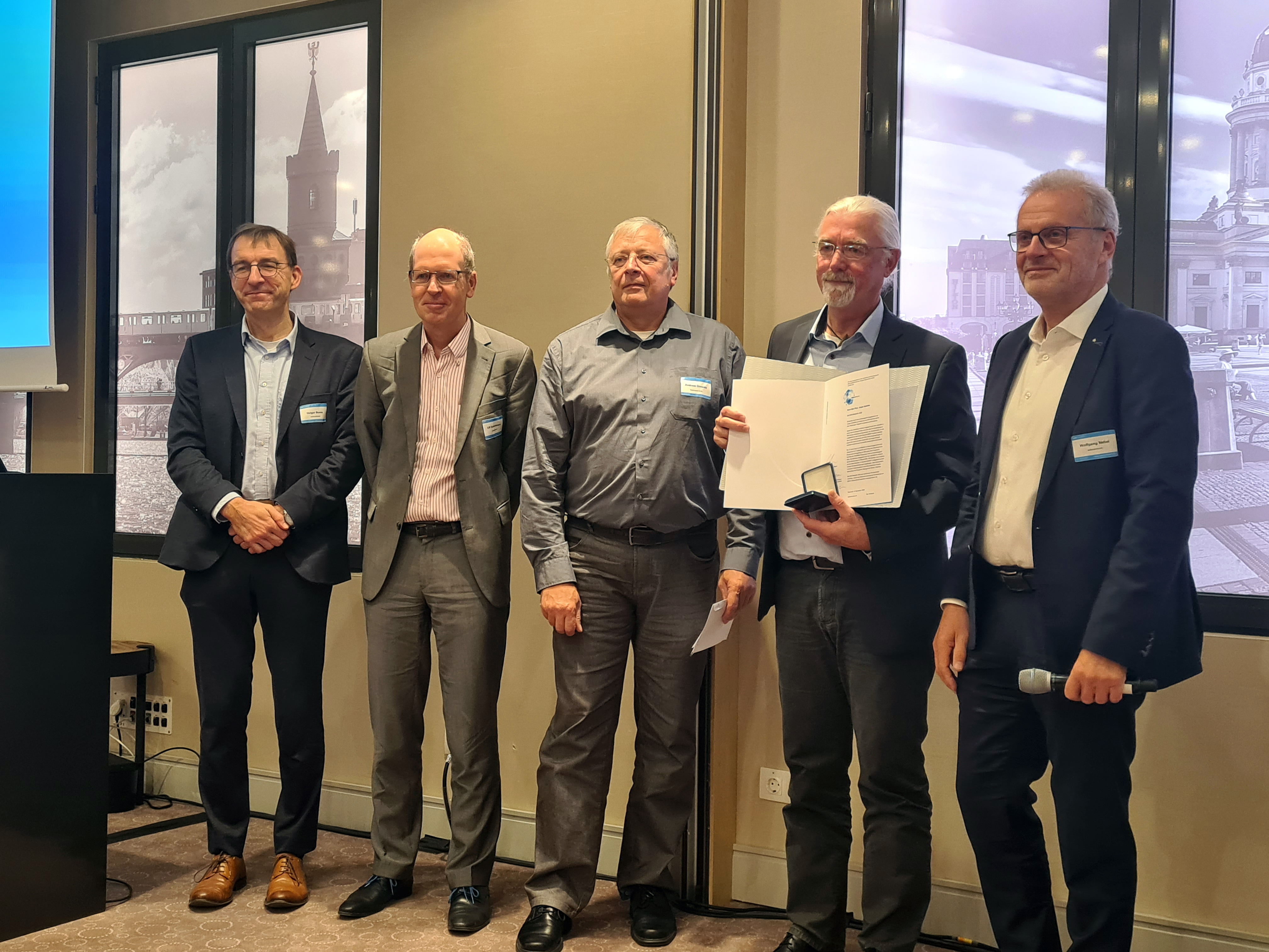 Dipl.-Phys. Jürgen Schlöffel bei der Verleihung der EDA-Medaille zusammen mit dem Vorstand des edacentrum und dem Laudator Andreas Glowatz von Siemens EDA