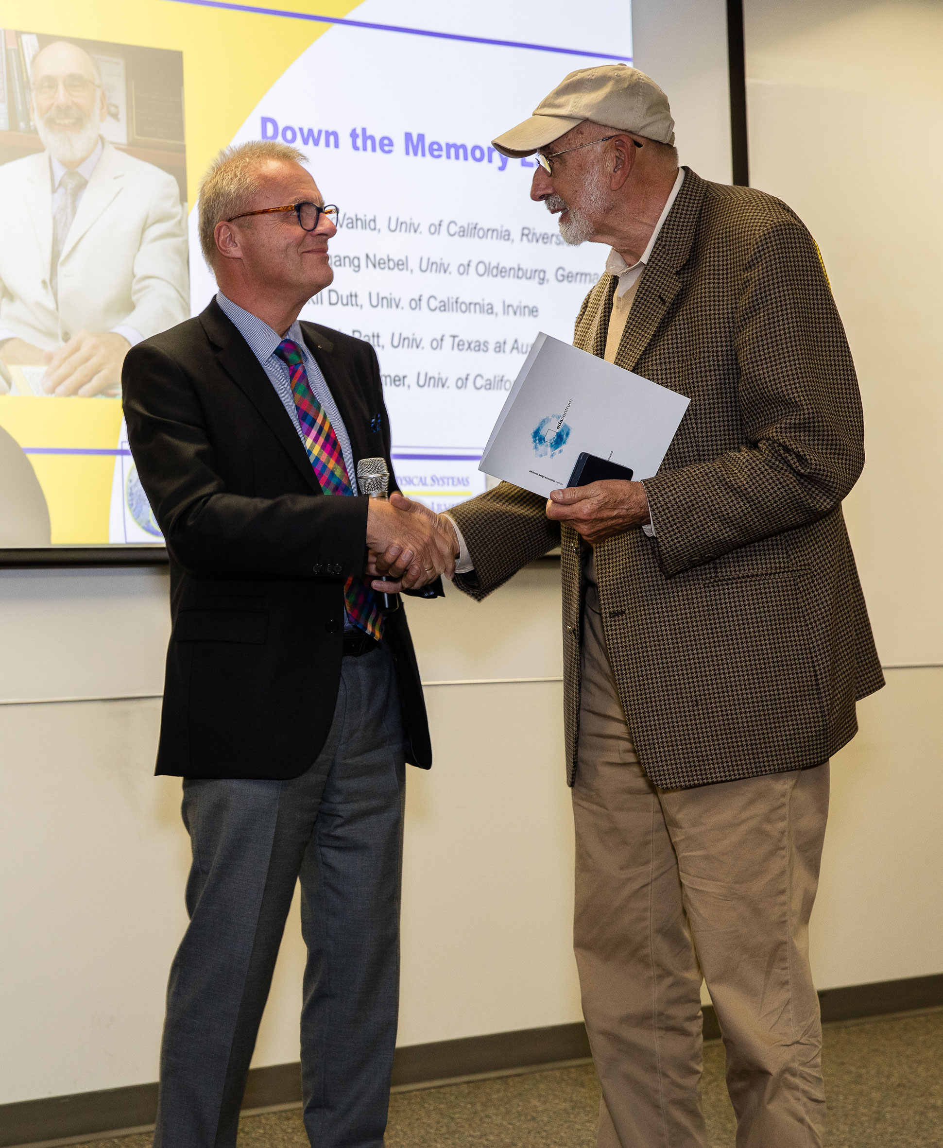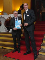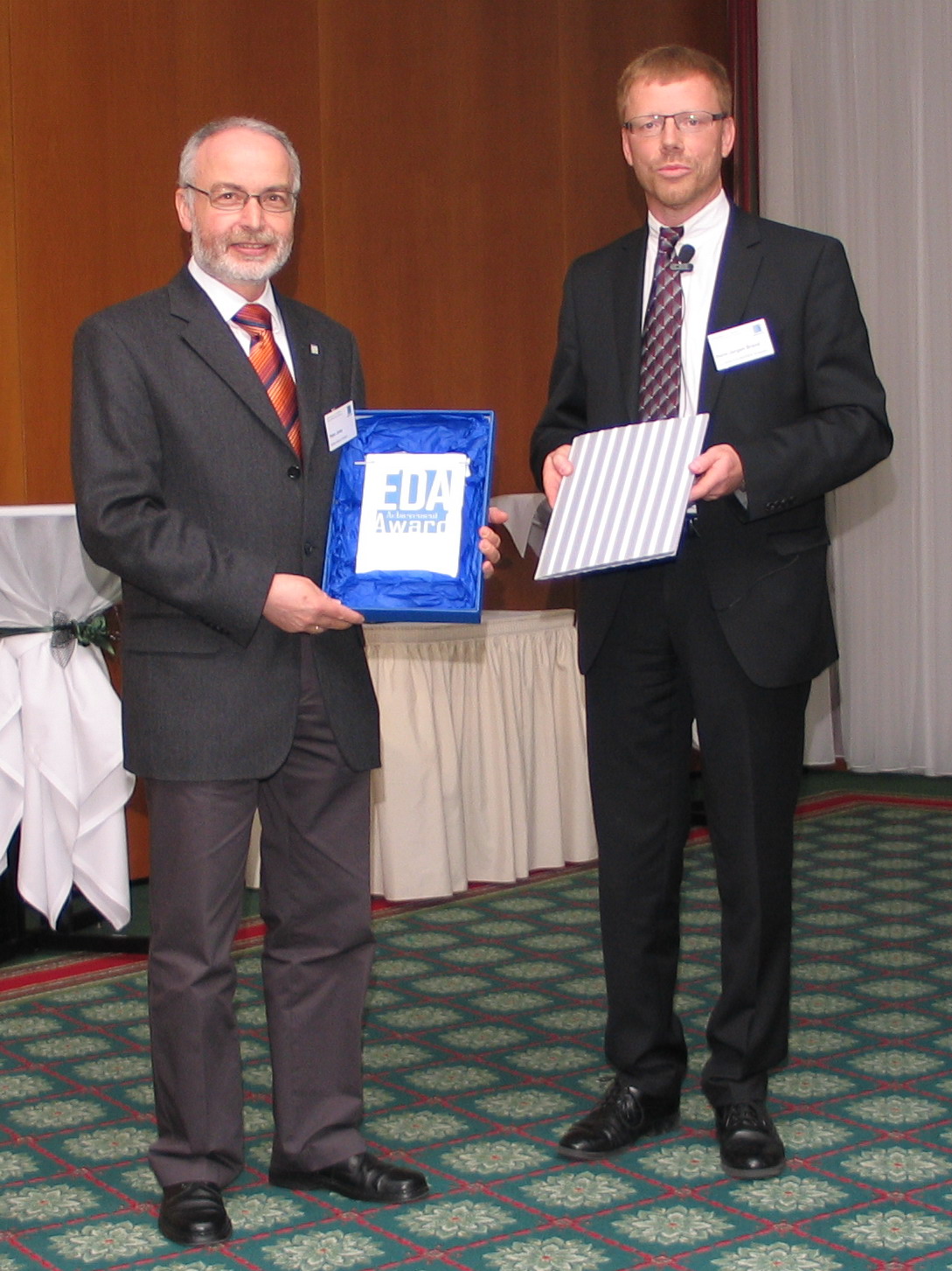 Peter Jores mit Dr. Hans-Jürgen Brand von GlobalFoundries nach der Laudatio bei der Übergabe des EDA-Achievement Awards 2010 im Auftrag des Vorstands des edacentrum e.V.; v.l.n.r.: Peter Jores, Dr.-Ing. H.J. Brand