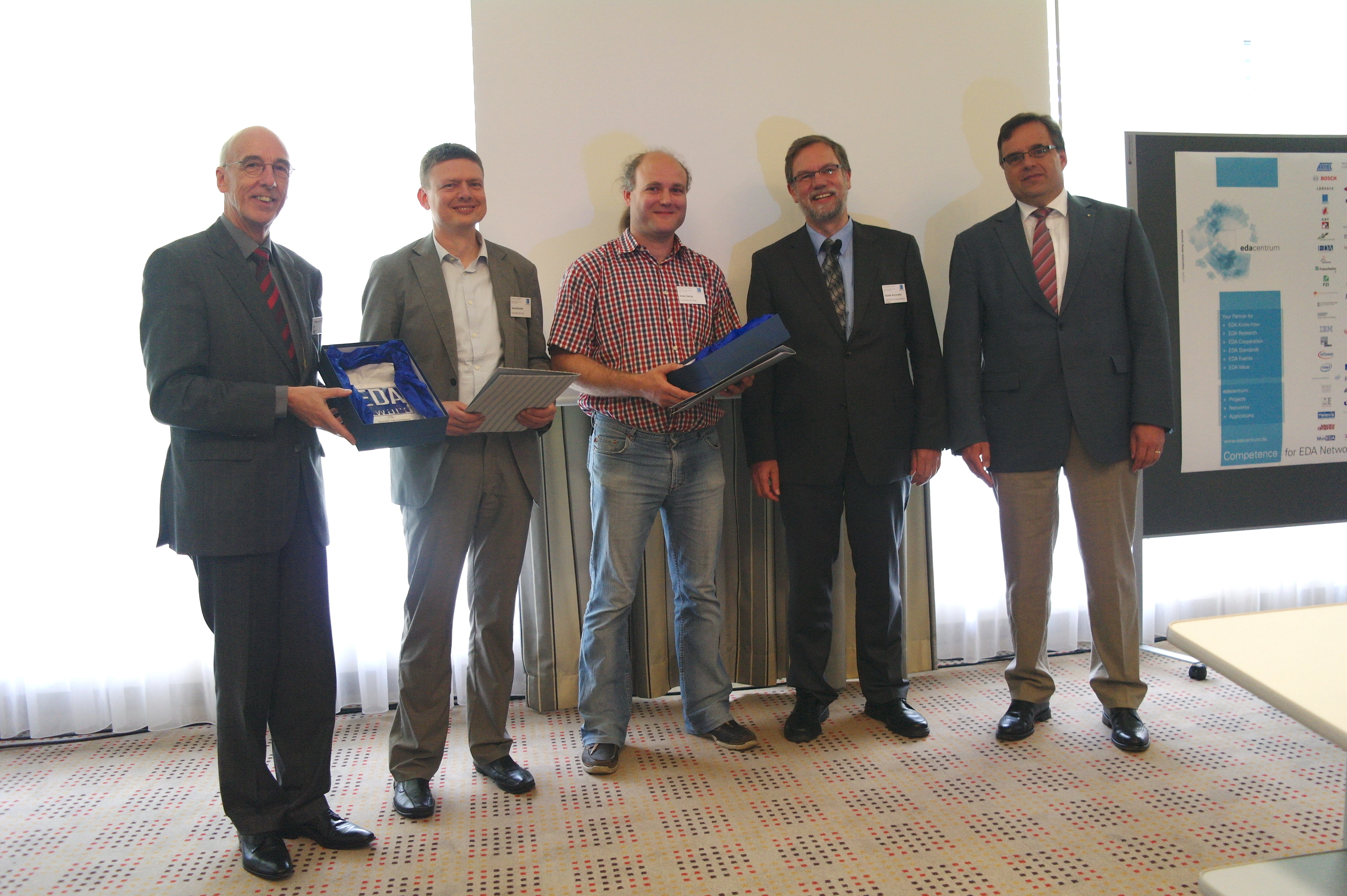 v.l.n.r.: Dr. Jürgen Haase und Prof. Dr. Wolfgang Nebel, Vorstandsmitglieder im edacentrum, Preisträger Axel Hald, Preisträger Georg Gläser, Laudator Prof. Dr.-Ing. Jürgen Scheible und Prof. Dr. Wolfgang Rosenstiel, Vorstandsmitglied im edacentrum