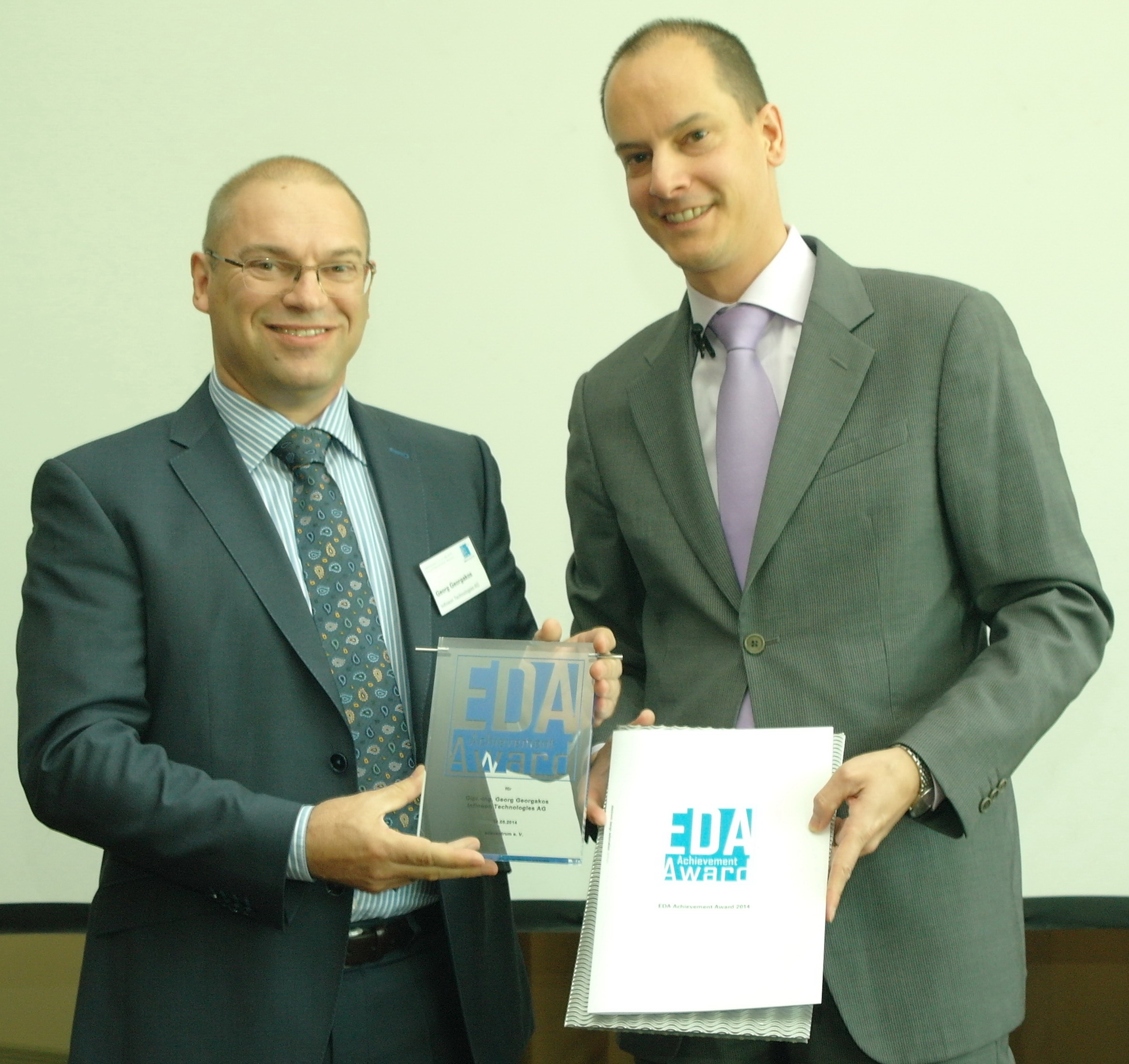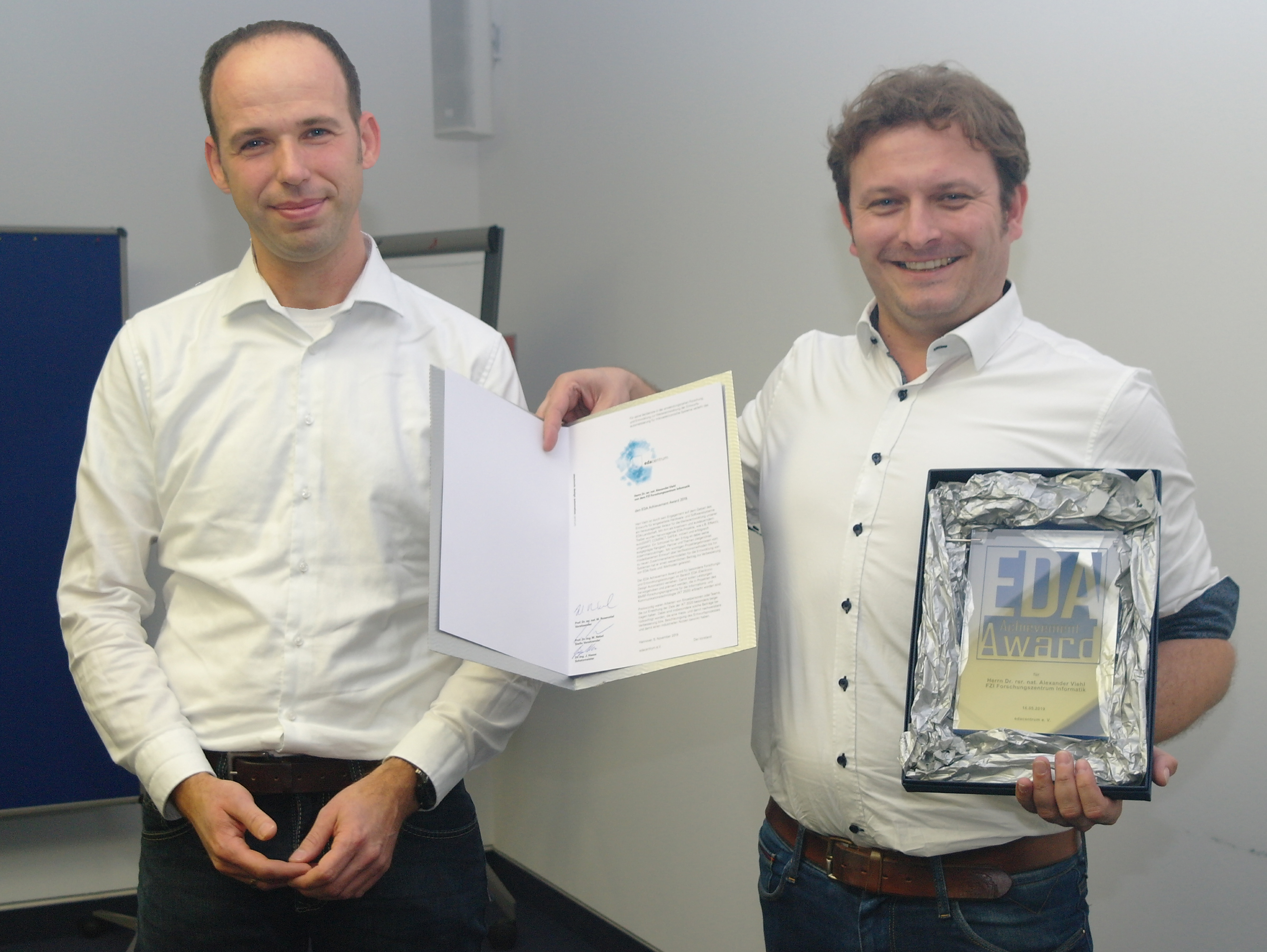 v.l.n.r.: Laudator Dr. Jan-Hendrik Oetjens von der Robert Bosch GmbH übereicht stellvertretend für das edacentrum den EDA Achievement Award 2019 an Dr. rer. nat. Alexander Viehl vom FZI Forschungszentrum Informatik