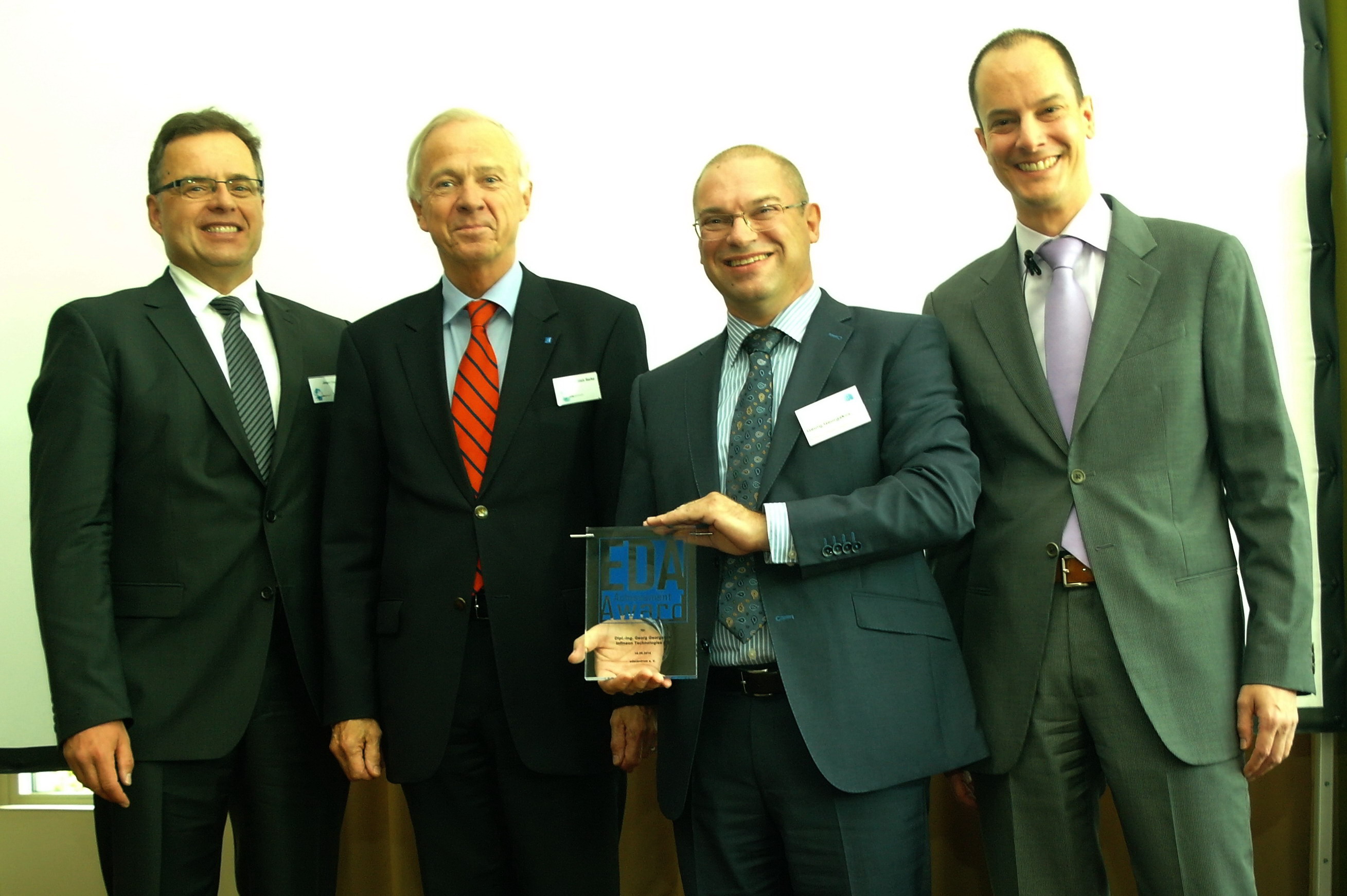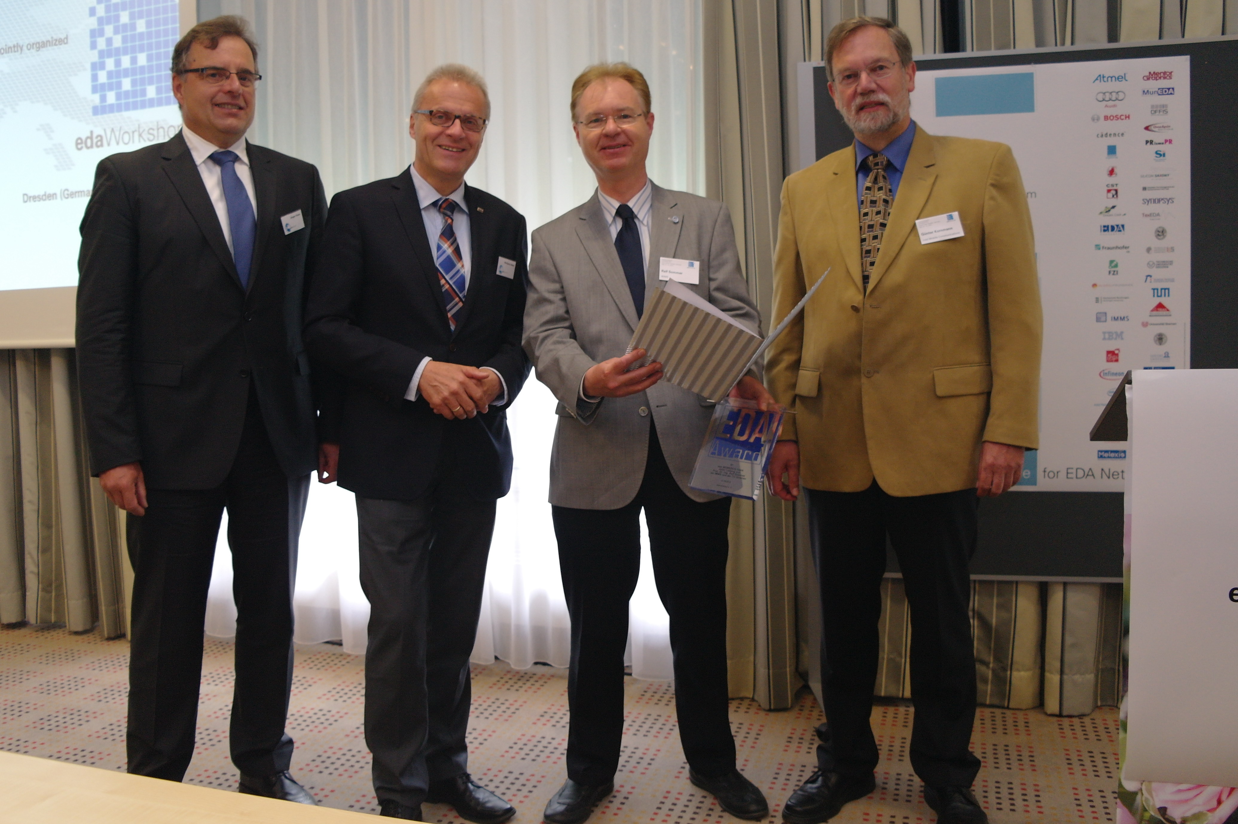 Preisträger Dipl.-Phys. Ralf Pferdmenges mit Dr.-Ing. Jürgen Haase und Prof. Dr. Wolfgang Nebel, Vorstandsmitglieder im edacentrum sowie Laudator Prof. Dr. Erich Barke.