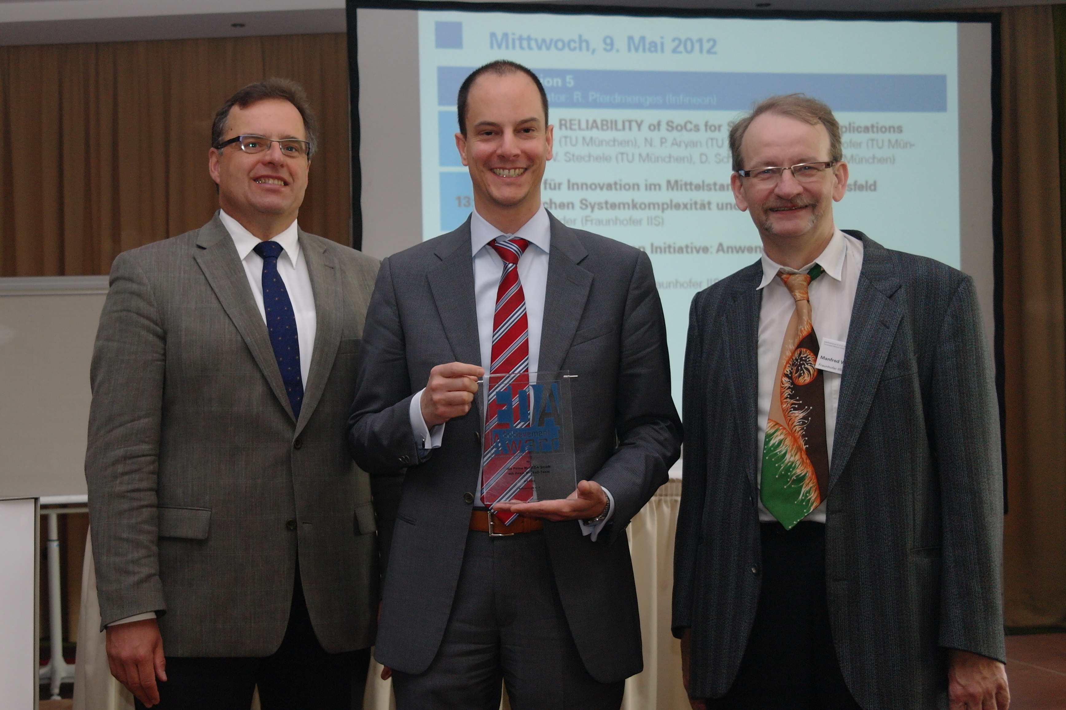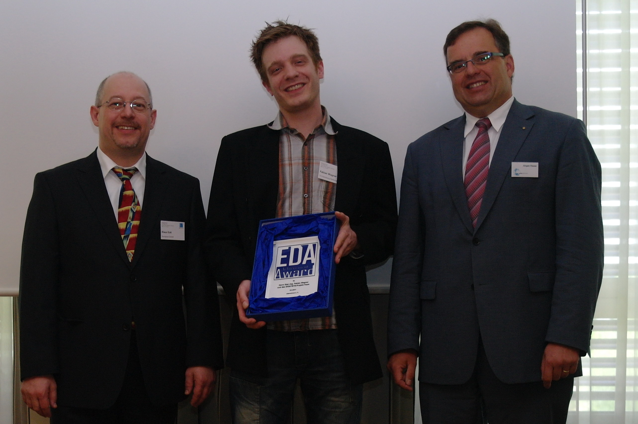 Fabian Wagner mit dem Laudator Klaus Eckl, Synopsys und Dr.-Ing. Jürgen Haase, Vorstandsmitglied im edacentrum