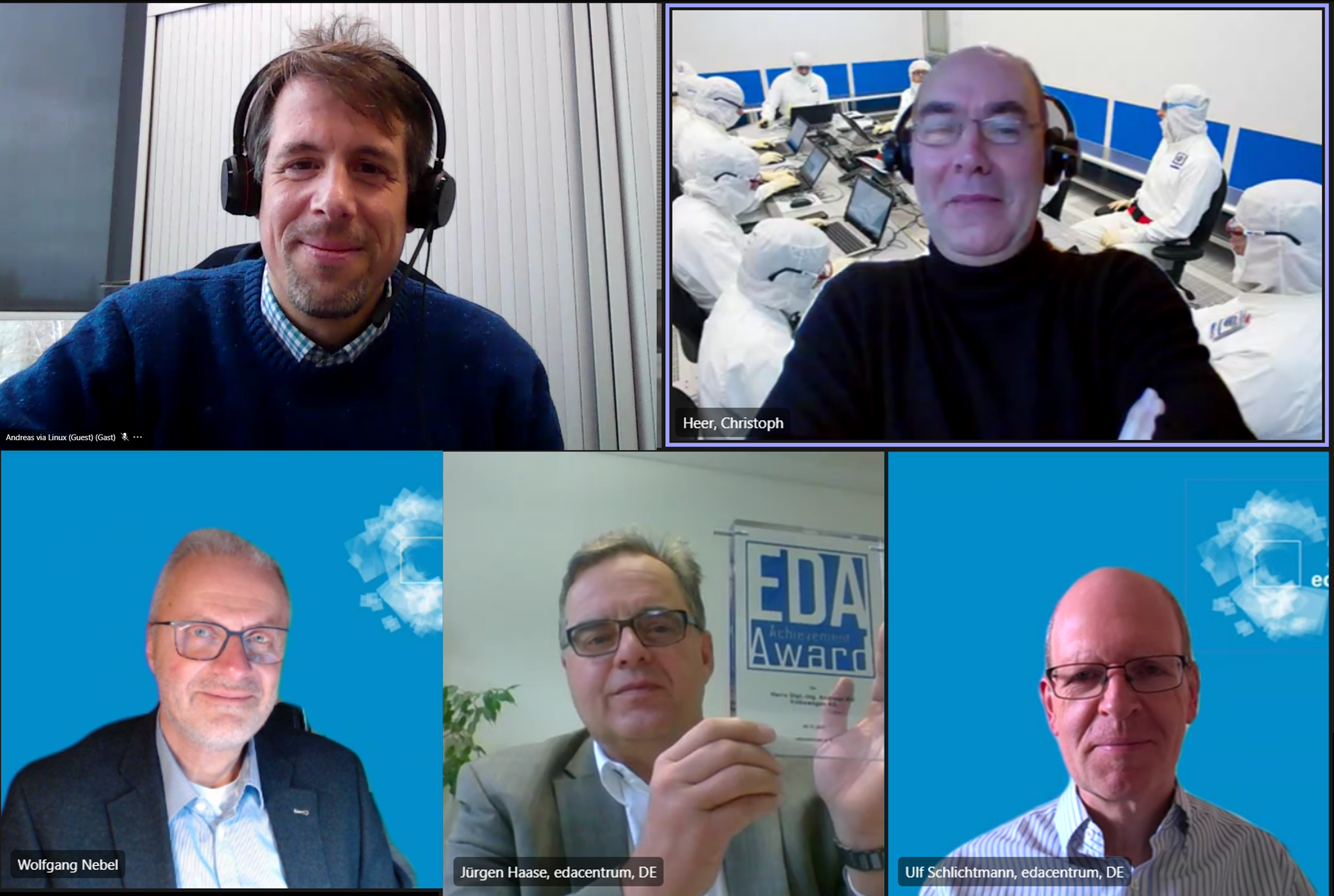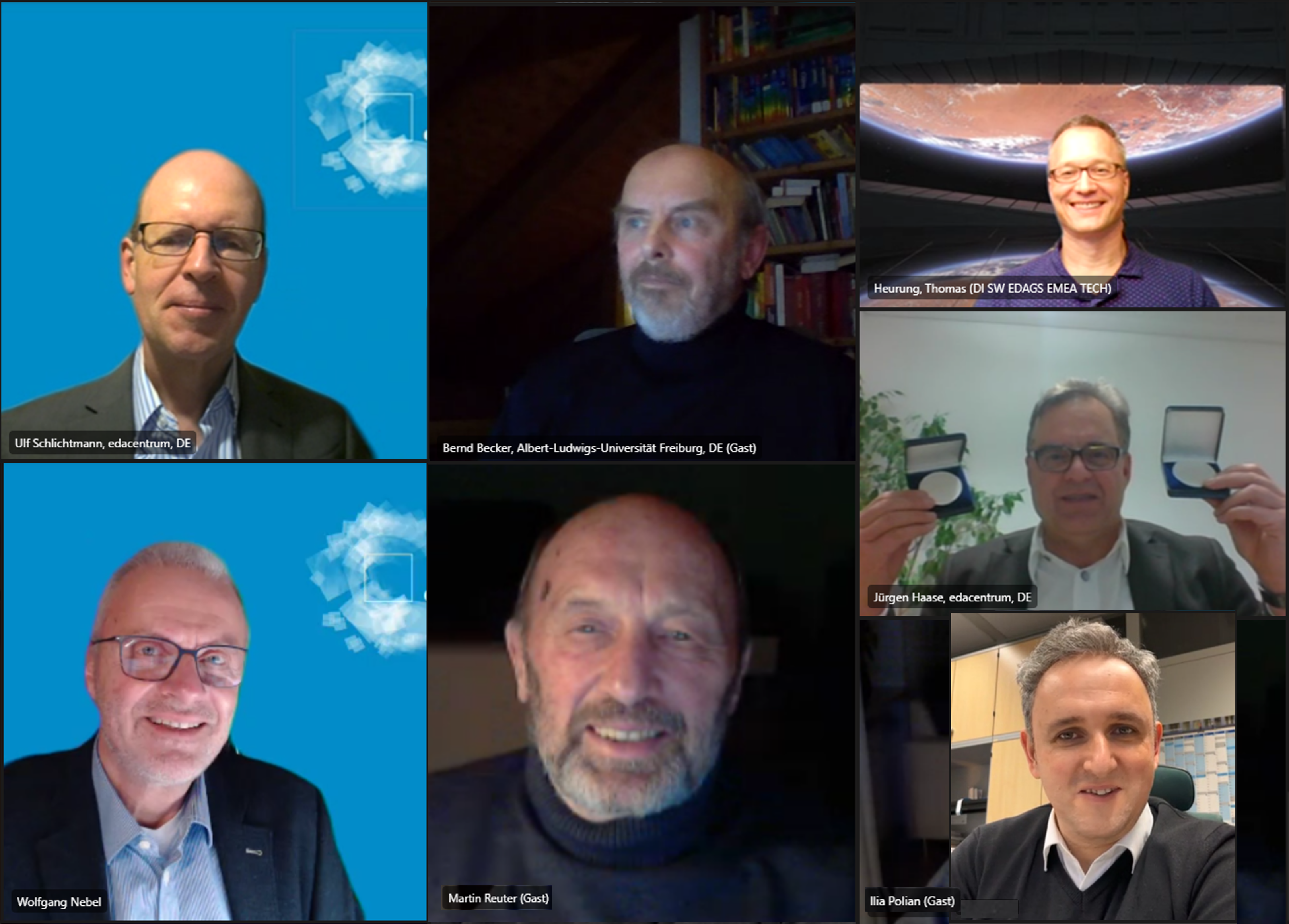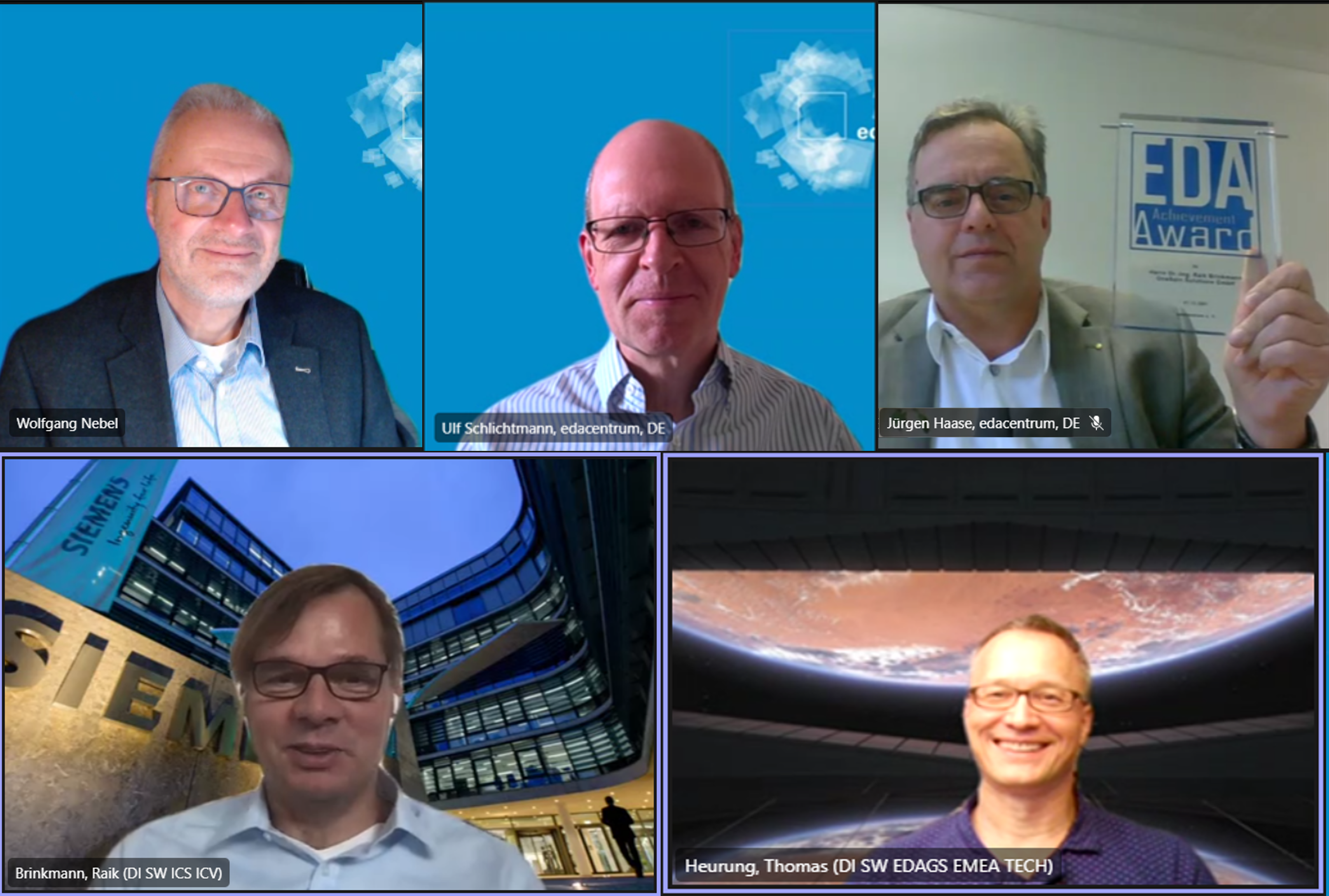 Obere Reihe v.l.n.r.: Prof. Dr. Wolfgang Nebel, Prof. Dr. Ulf Schlichtmann und Dr. Jürgen Haase, Vorstandsmitglieder im edacentrum Untere Reihe v.l.n.r.: Dr.-Ing. Raik Brinkmann, Laudator Thomas Heurung (Siemens EDA GmbH) überreicht virtuell stellvertretend für das edacentrum den EDA Achievement Award 2021