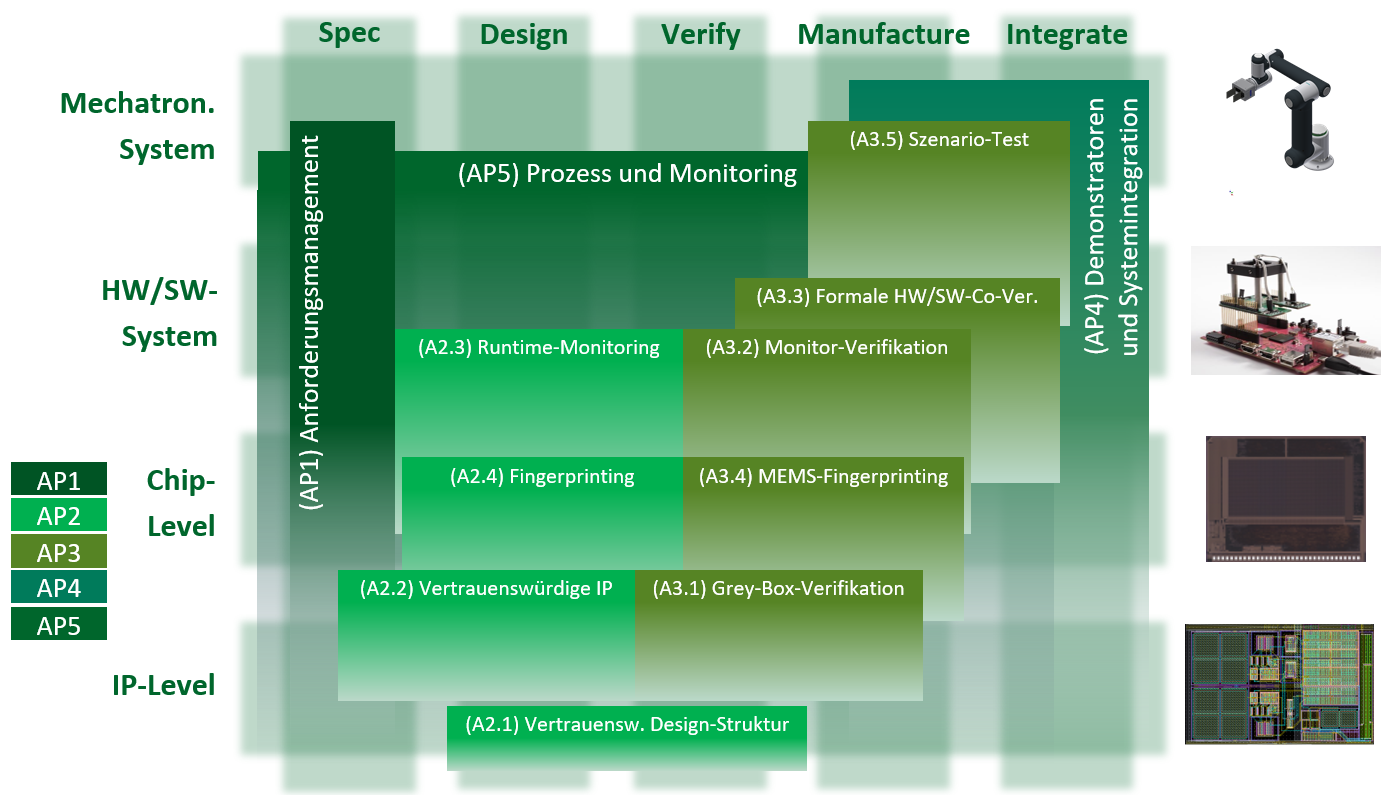 Die VE-VIDES-Maßnahmen adressieren die hier in der Entwurfsmatrix gezeigten Entwurfsschritte und Hierarchieebenen, um Entwicklungsverfahren für vertrauenswürdige Hardware-IPs und deren Integration entlang der Wertschöpfungsketten in den Bereichen Automotive und Industrie 4.0 zu verbessern.