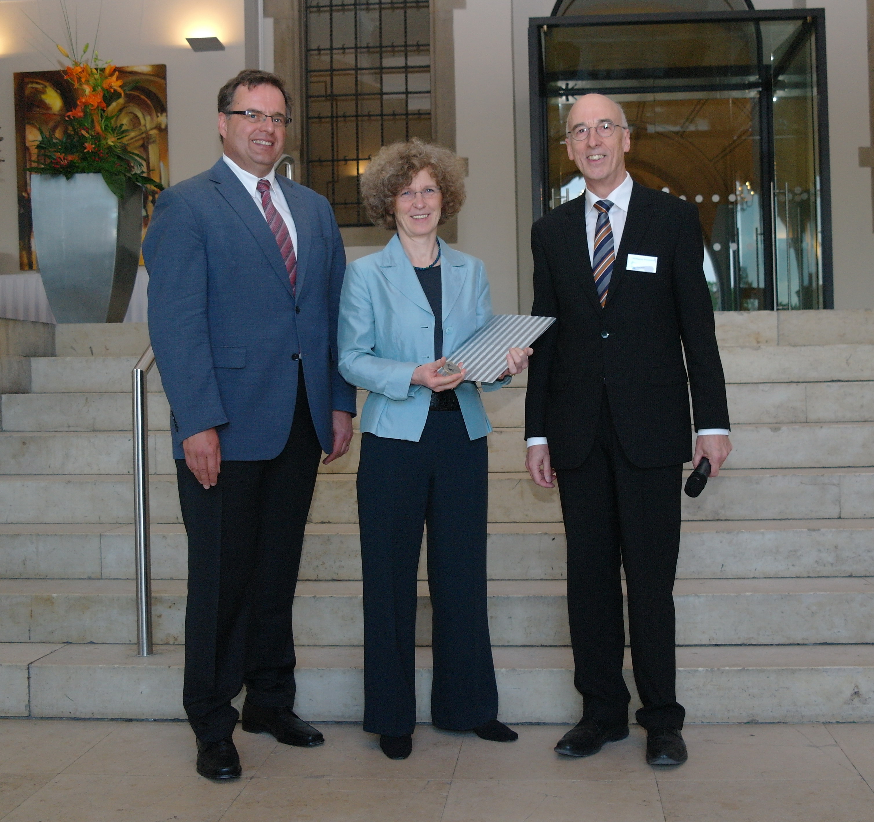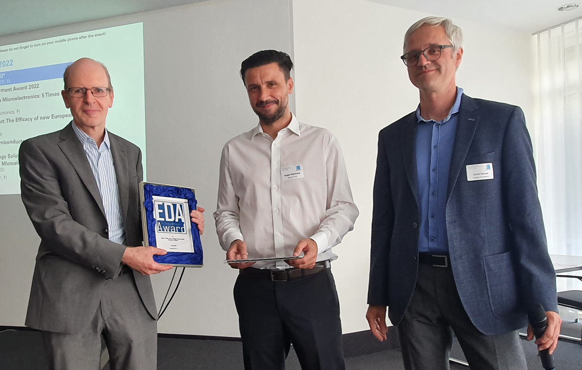 v.l.n.r.: Prof. Dr. Ulf Schlichtmann (Vorstand edacentrum), Dipl.-Ing. Holger Eisenreich und Laudator Dr. Ulrich Hensel (GLOBALFOUNDRIES Dresden)