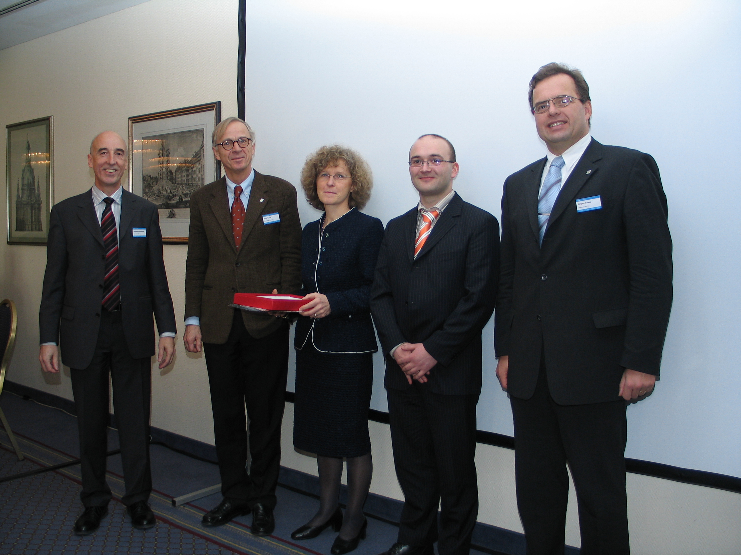 v.l.n.r.: Prof. Dr. Wolfgang Rosenstiel und Prof. Dr. Erich Barke, Vorstandsmitglieder im edacentrum, Dipl.-Math. Irmtraud Rugen-Herzig von Infineon in Vertretung für Preisträger Dr. Ralf Sommer, Preisträger Dipl.-Ing. Göran Jerke und Dr. Jürgen Haase, Vorstandsmitglied im edacentrum