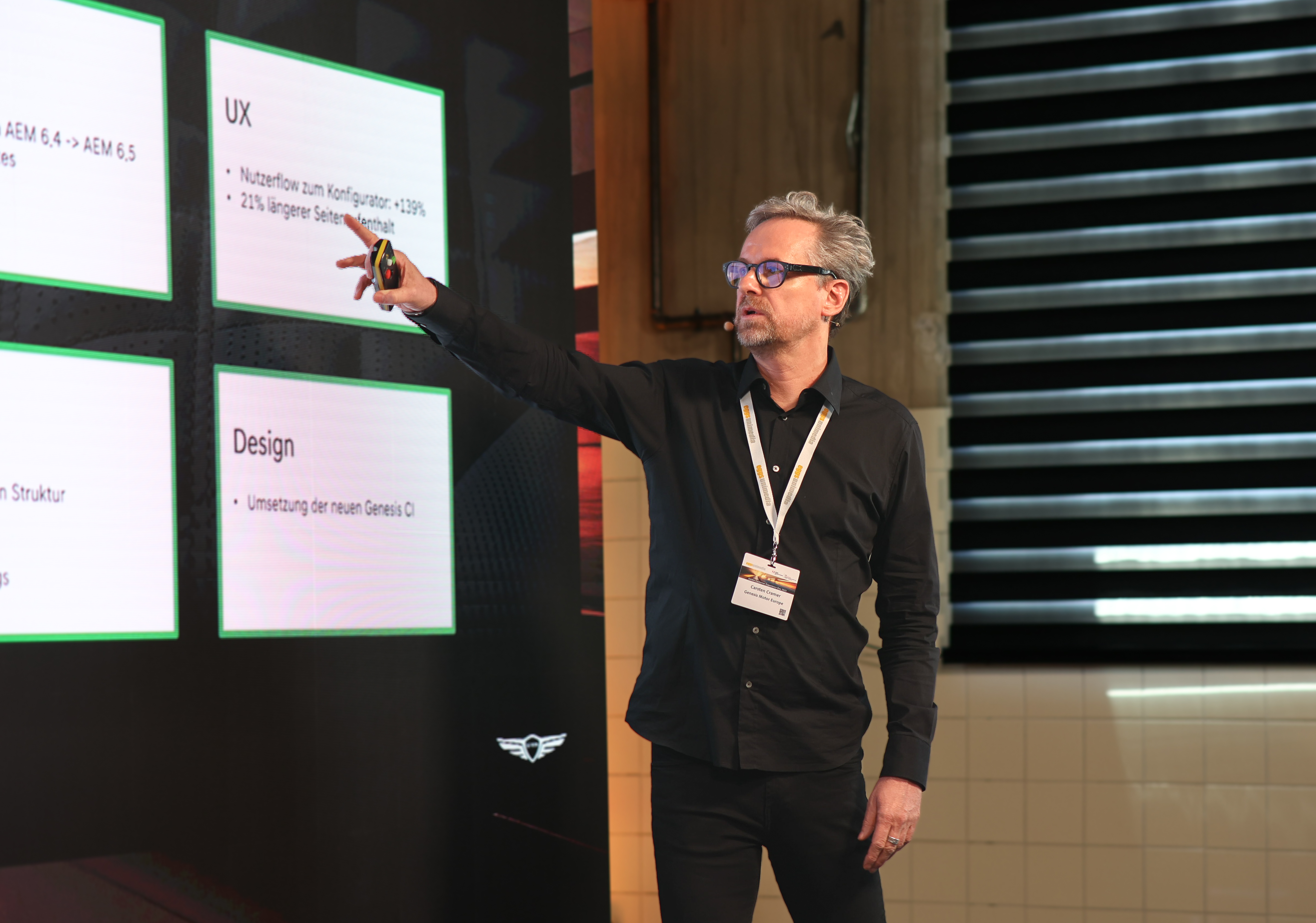 Anschließend wurde mit Spannung der erste Kundenvortrag des Tages erwartet. Carsten Cramer, Marketing Manager bei Genesis Motor Europe und Michael Deiß, Geschäftsführer von eggs unimedia, berichteten gemeinsam über die Marketing Strategie von Genesis - und wie die Adobe Experience Manager (AEM) Technologie dabei unterstützt. Genesis ist Premium Marke im Portfolio der Hyundai Motor Group. Im Heimatmarkt Korea und in den USA ist die Marke bereits höchst erfolgreich. Seit 2022 arbeitet Genesis mit dem Technologiepartner eggs unimedia und der Hamburger Agentur Argonauten zusammen, um die Customer Experience der Premiummarke auf ein neues Level zu heben. Das Erfolgsrezept der Marke: eine performante DX-Plattform zur Ausspielung der Inhalte, ein modernes Direct-to-consumer (D2C) Vertriebsmodell, einzigartige, personalisierte Services sowie serienmäßige Rundum-Sorglos-Pakete.