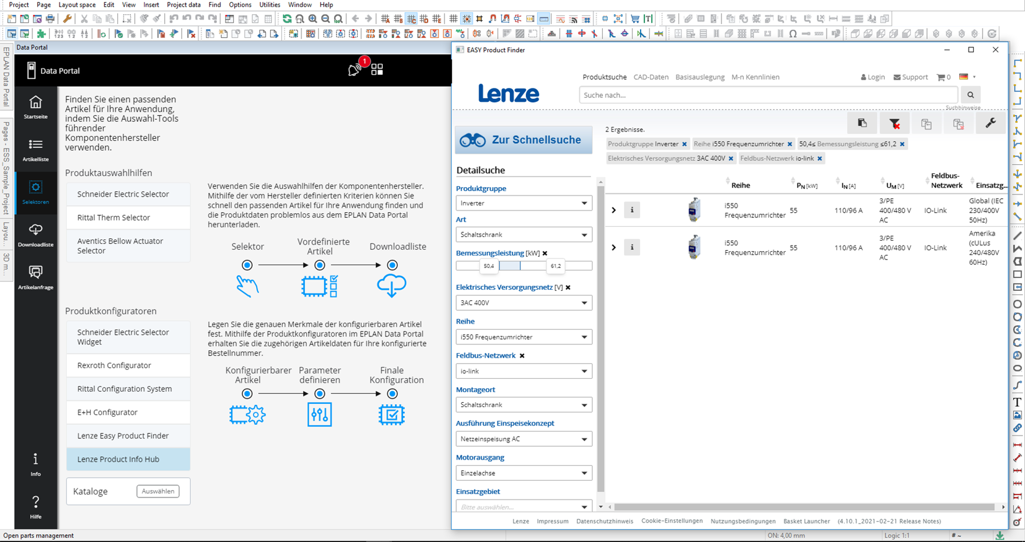 (pressebox) (Monheim, 02.07.2021) Die Auswahl passender Produktdaten im Engineering ist aufwendig. Mit einem neuen Nutzer-Interface und verbesserten Suchalgorithmen sorgt das neue Eplan Data Portal hier für mehr Komfort und Tempo. Durch erweiterte Suchparameter gelangt der Anwender schneller zur exakt passenden Komponente. Auch individuelle Lösungen auf Basis von Konfiguratoren lassen sich intuitiv generieren – wie der Produktkonfigurator von Lenze zeigt.