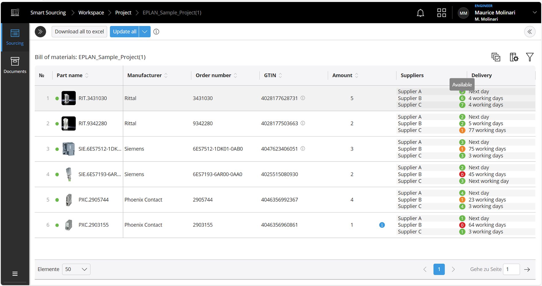 Eplan Business Owner for Data Driven Business Solutions (DDBS) Maurice Molinari explains: “Eplan Smart Sourcing allows design engineers to check very early in the process whether all items will be available at the planned delivery date. If a component isn’t in stock or can’t be delivered in time, they can already choose an alternative for the design. Discontinued components can be replaced by their current versions. This saves unnecessary, repeated coordination with procurement at a later stage when ordering components.” A requirement for this to work is that the component manufacturer or distributor is connected to Eplan Smart Sourcing.