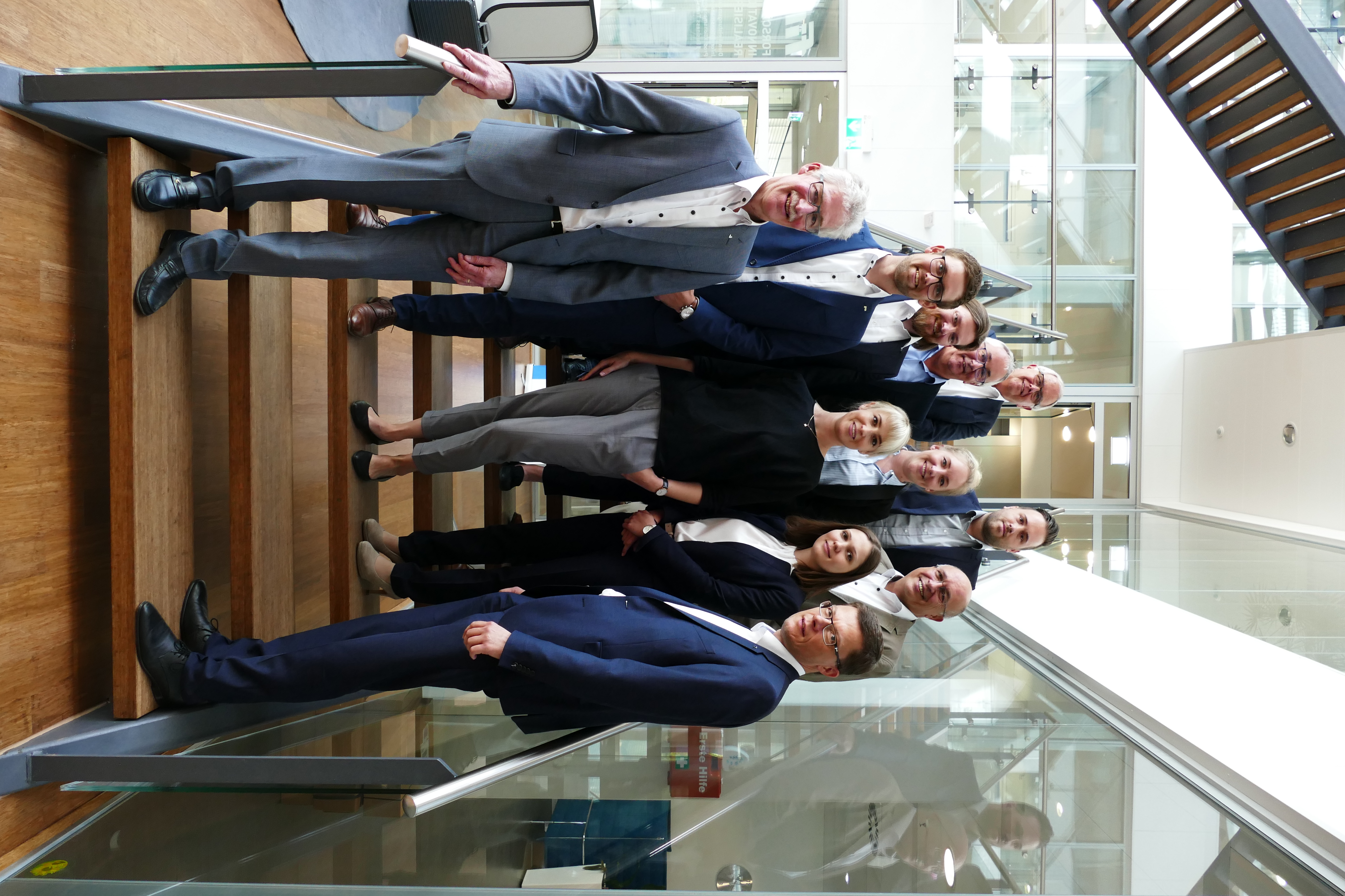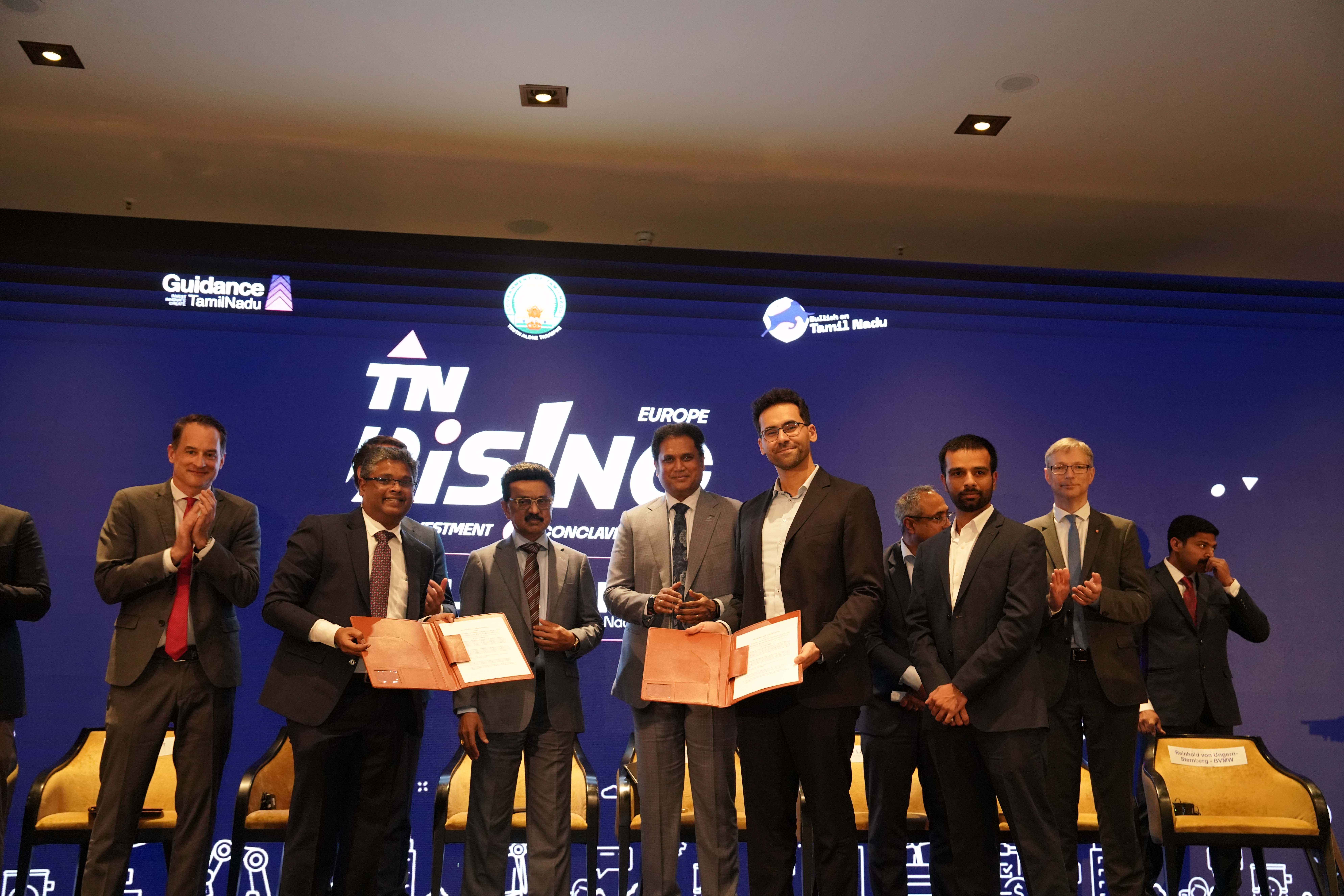 Felix Neugart (CEO, NRW.Global Business), V. Arun Roy, I.A.S. (Hauptsekretär, Ministerium für Industrie, Regierung von Tamil Nadu), Hon. M.K. Stalin (Ministerpräsident von Tamil Nadu), Hon. Dr. TRB Rajaa (Minister für Industrie, Investitionsförderung und Handel, Regierung von Tamil Nadu), Dr.-Ing. Akram Idrissi (ITA – RWTH Aachen), Varqha Bagwan (ITA – RWTH Aachen) und Reinhold von Ungern-Sternberg (BVMW) (von links nach rechts), Quelle: Guidance Tamil Nadu