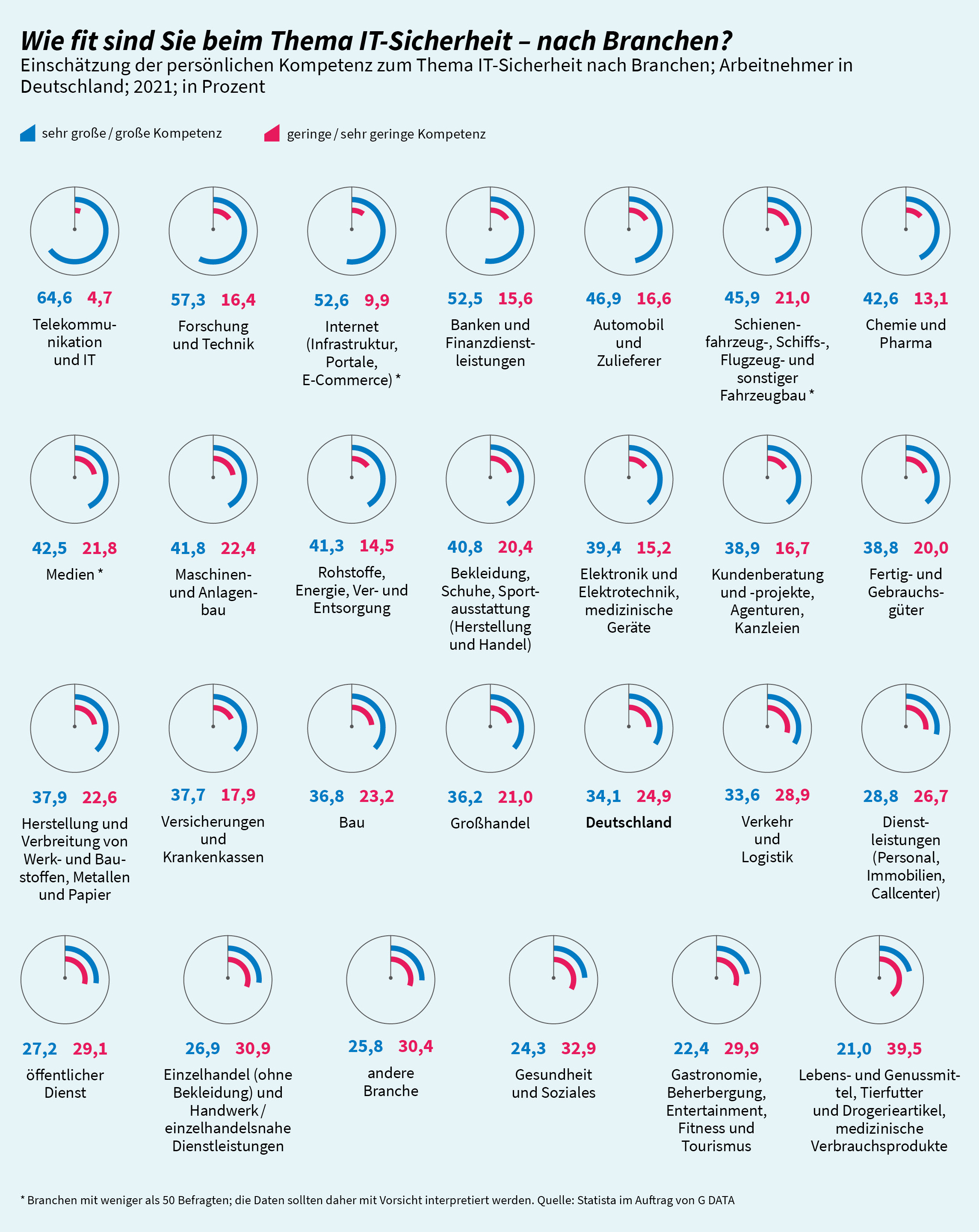 Die Ergebnisse der Studie „Cybersicherheit in Zahlen“ von G DATA CyberDefense, Statista und brand eins zeigen, wie die Arbeitnehmer*innen in den einzelnen Branchen ihre persönliche Kompetenz zum Thema IT-Sicherheit einschätzen. Das IT-Sicherheitsniveau der Unternehmen in Deutschland unterscheidet sich stark: Während in Forschung und Technik ebenso wie bei Banken und Finanzdienstleistern gut jeder Zweite seine Kompetenz als sehr groß oder groß einschätzt, glaubt im öffentlichen Dienst, in der Dienstleistungsbranche, im Gesundheitswesen oder in der Gastronomie nicht einmal jeder Dritte an seine eigenen Fähigkeiten im Bereich der IT-Sicherheit. Das sind alarmierende Ergebnisse in Anbetracht der Tatsache, dass auch in den Branchen mit niedrigem Sicherheitsniveau viele sensible, personenbezogene Daten in den Händen der Cyberkriminellen landen könnten.