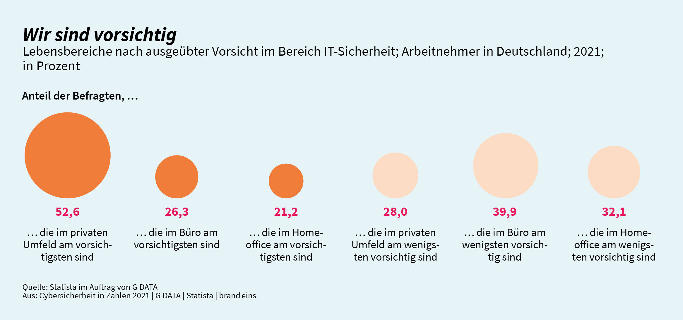 Im privaten Umfeld ist ein vorsichtiger Umgang im IT-Bereich für viele Nutzer*innen dagegen ein großes Thema. Das geben mehr als 52 Prozent der Befragten der Umfrage „Cybersicherheit in Zahlen“ von G DATA CyberDefense, Statista und brand eins an. Obwohl auch im beruflichen Umfeld IT-Sicherheit wichtig ist, nehmen es viele am Arbeitsplatz nicht ganz so genau. Denn vier von zehn Angestellten sind im Büro unvorsichtig. Dadurch wird das Risiko gesteigert, in das Visier von Cyberkriminellen zu geraten. Ihre Angriffsmethoden werden immer raffinierter und viele Phishing-Mails lassen sich kaum von echten unterscheiden. Wer hier falsch klickt, öffnet Cyberkriminellen den Weg auf seinen Computer und ins Netzwerk des Unternehmens.