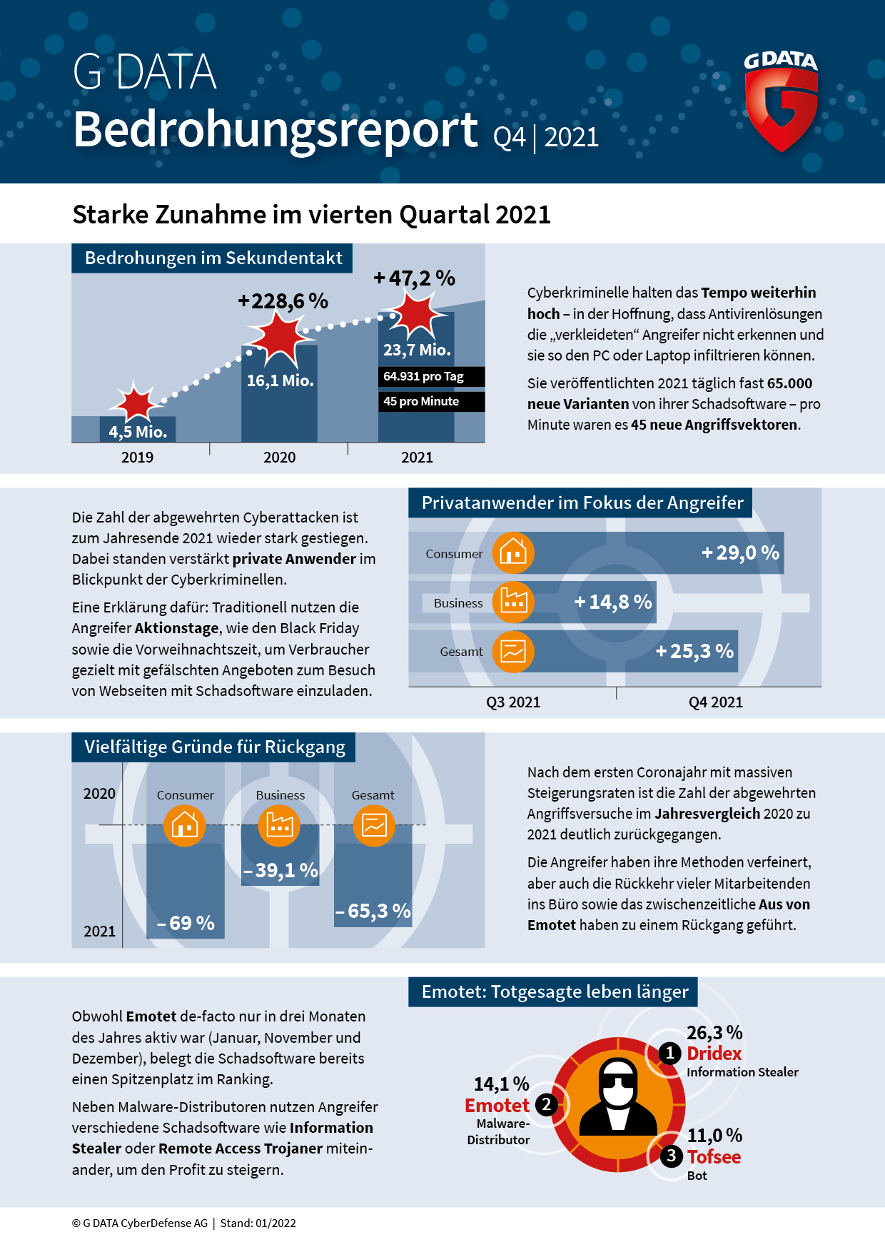 (pressebox) (Bochum, 08.02.2022) Der aktuelle G DATA Bedrohungsreport verzeichnet erstmals wieder eine starke Zunahme bei abgewehrten Angriffsversuchen auf Unternehmen und private Anwender. Vom dritten zum vierten Quartal 2021 stieg die Zahl der Angriffsversuche um 25 Prozent. Die Rückkehr von Emotet und große Sicherheitslücken in öffentlich zugänglichen Diensten sind nur die Spitze des Eisbergs.