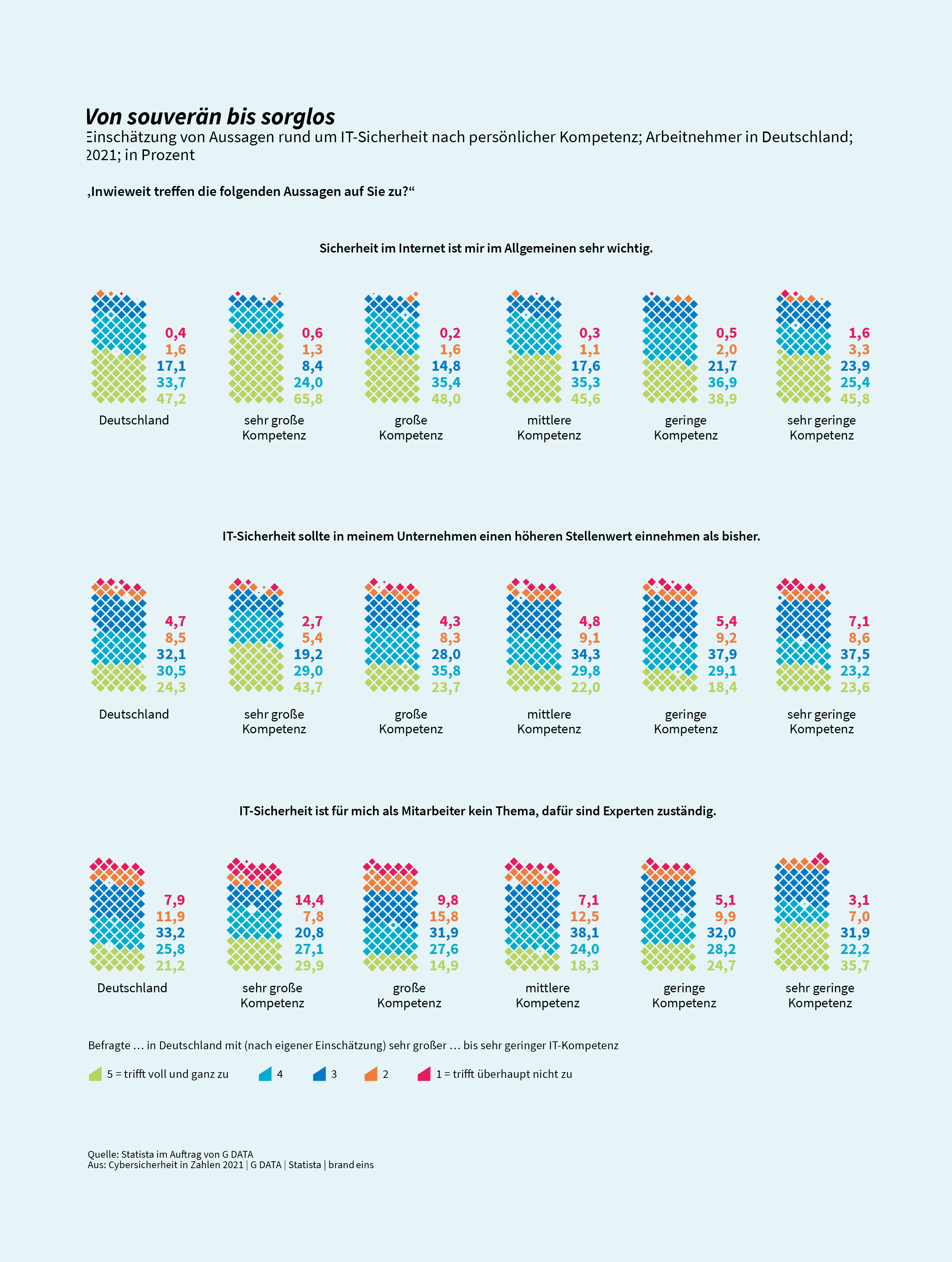 „Sicherheit im Internet“ spielt in Deutschland eine zentrale Rolle – sowohl privat als auch beruflich. Das belegt eine aktuelle Umfrage von G DATA CyberDefense in Zusammenarbeit mit Statista. Allerdings offenbart die Studie „Cybersicherheit in Zahlen“ auch große Unterschiede: Befragte mit großer IT-Sicherheitskompetenz sind grundsätzlich kritischer beim Bereich „Security“ als Menschen mit wenig IT-Sicherheitsfachwissen. So stimmen knapp 75 Prozent der Personen mit einer höheren Kompetenz der Aussage zu, dass IT-Sicherheit in ihrem Unternehmen einen höheren Stellenwert einnehmen sollte als bisher. Im Gegensatz dazu stimmen nur 46 Prozent der Befragten mit einer geringeren IT-Sicherheitskompetenz zu. Eine Erklärung für die Diskrepanz: Wer sich mit IT-Sicherheit auskennt, versteht den Sinn und Zweck von beispielsweise VPN oder Zwei-Faktor-Authentifizierung und kann besser einschätzen, wie gut es um die IT-Sicherheit im Unternehmen steht.