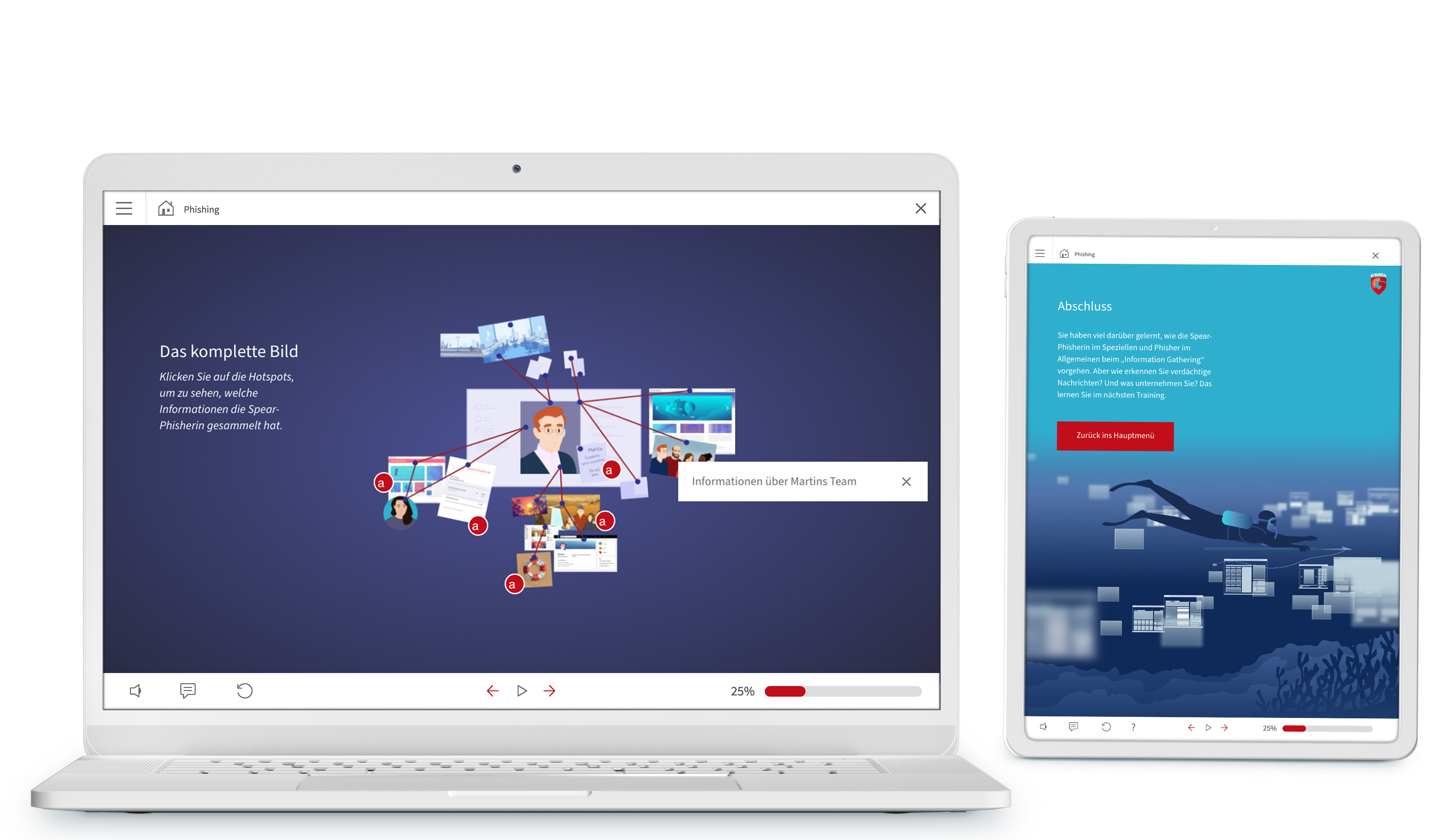 Auf der Lernreise folgen die Mitarbeitenden vier Hauptcharakteren, die jeweils für einen bestimmten Nutzertypen in Kombination mit einem unterschiedlichen Angriffsweg für die Phishing-Attacken stehen. Sie dienen den Lernenden als Identifikationsfiguren während der gesamten Reihe. „Phishing“ leitet sich, naturgemäß, vom Wort „Fishing“ ab. Um dieser Analogie treu zu bleiben, finden die Trainings größtenteils in einer Unterwasserwelt statt. Die Lernreihe bietet einen sehr hohen Interaktionsgrad. Klassische Formate wie Drag & Drop-Aufgaben oder Multiple-Choice-Fragen werden durch das Game-based-Setting in Kombination mit der Story neu interpretiert, indem Lernende beispielsweise Falschaussagen in Fischernetze ziehen, U-Boote mit Luftblasen füllen oder den Scheinwerfer des U-Bootes auf die richtige Antwortmöglichkeit richten müssen. Höhepunkt und Abschluss der Reihe ist ein digitaler Escape-Room. Dieser ist in der „Höhle“ eines der Antagonisten, der „Spear-Phisherin“, lokalisiert. Aus dieser Höhle heraus plant sie ihre Angriffe. Dort sind Hinweise versteckt, mit denen die Lernenden eine geplante Attacke der Spear-Phisherin mit ihrem gesammelten Wissen aus der Trainingsreihe vereiteln müssen, um dann im Anschluss zurück an die Oberfläche zu gelangen. Über diesen Weg setzen sich die Lernenden intensiv mit Phishing-Angriffen aus dem realen Leben auseinander und lernen insbesondere die Schutzmechanismen besser kennen.