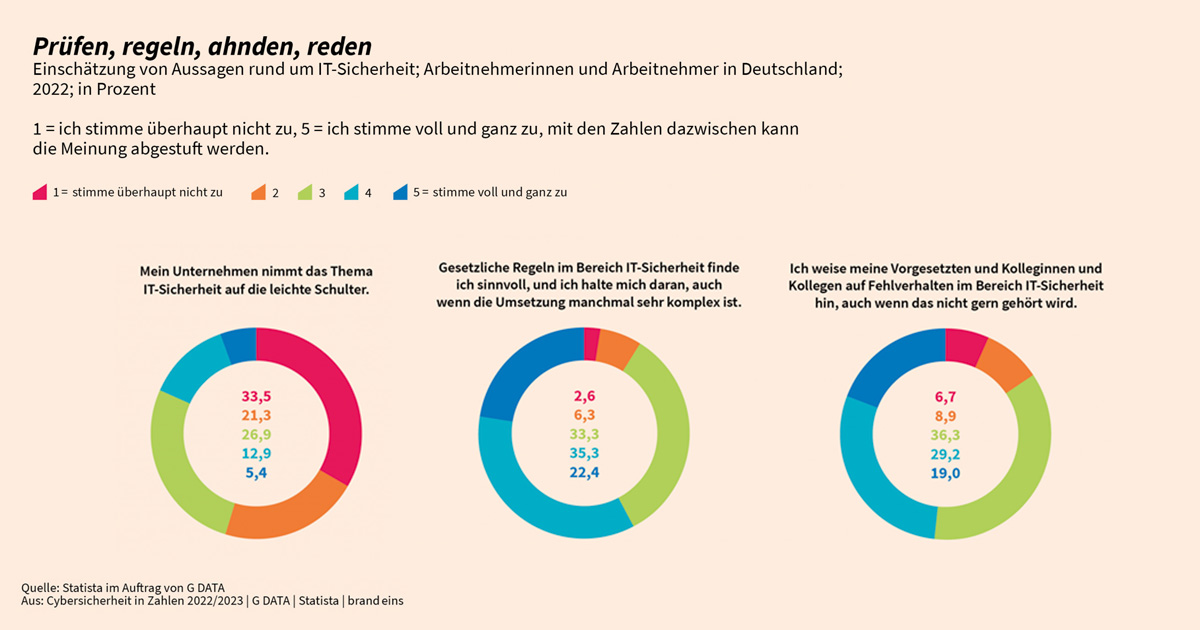(pressebox) (Bochum, 01.12.2022) Unternehmen nehmen das Thema IT-Sicherheit weiterhin auf die leichte Schulter. Das belegt die aktuelle Studie „Cybersicherheit in Zahlen“ von G DATA CyberDefense, Statista und brand eins. 18,3 Prozent der Arbeitnehmer*innen geben an, dass die Firma, für die sie arbeiten, Warnungen zu Schwachstellen und kritischen Sicherheitslücken unterschätzt. Die Konsequenz: Sie schützen sich unzureichend vor unbefugten Eindringlingen im Netz.