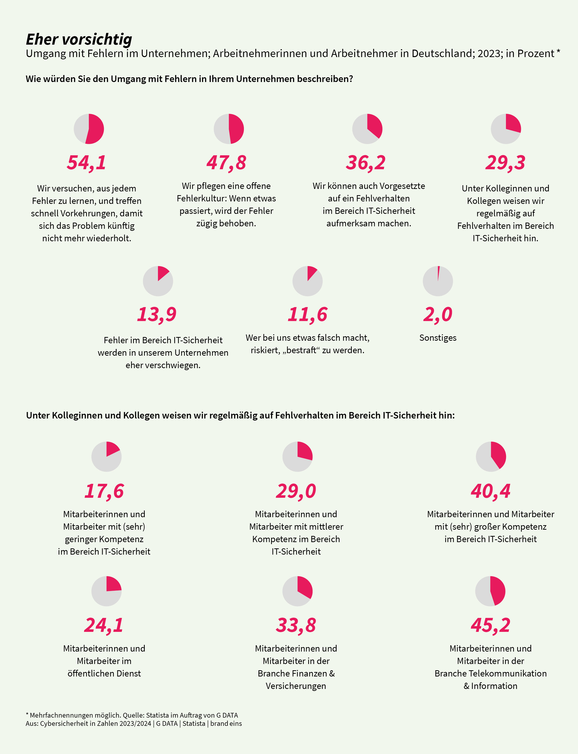 (pressebox) (Bochum, 26.10.2023) Rund 50 Prozent der deutschen Firmen haben erheblichen Nachholbedarf beim Thema Fehlerkultur im Bereich IT-Sicherheit. Das zeigt die aktuelle repräsentative Studie „Cybersicherheit in Zahlen“ von G DATA CyberDefense, Statista und brand eins. Fast zwei Drittel der deutschen Angestellten weisen Vorgesetzte nicht auf Cybersecurity-Fehlverhalten hin. Das Fatale: Eine unzureichende Fehlerkultur erhöht die Anfälligkeit für Cyberbedrohungen und gefährdet somit die Gesamtsicherheit von Unternehmen.
