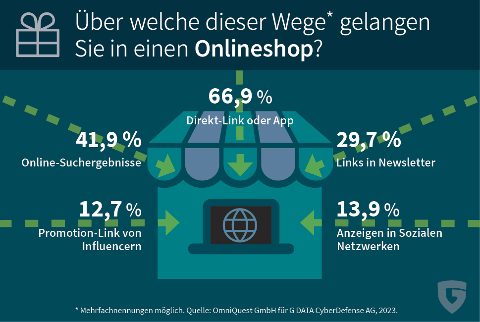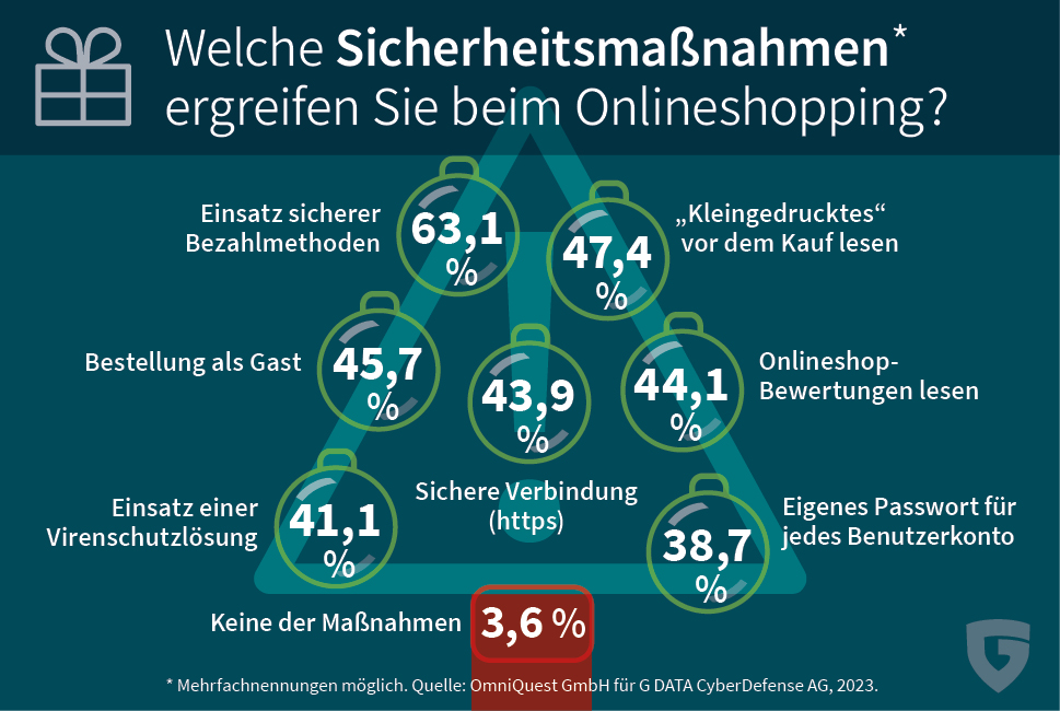 (pressebox) (Bochum, 21.11.2023) Der Black Friday steht unmittelbar bevor und viele Onlineshops locken mit Rabatten auf Artikel, die auf den Wunschzetteln von Familie und Freunden stehen. Im Onlineshopping-Rausch ist für die Deutschen allerdings nur der Preis entscheidend und nicht die eigene IT-Sicherheit, wie eine repräsentative Umfrage von G DATA CyberDefense zeigt: Nur zwei von fünf Befragten haben einen Virenschutz im Einsatz und nur 38 Prozent nutzen für jedes Onlinekonto ein eigenes, starkes Passwort. Hierdurch werden Onlineshopper zur leichten Beute für Betrüger. G DATA CyberDefense rät zur Vorsicht und gibt Tipps für den sicheren Geschenkekauf im Netz.