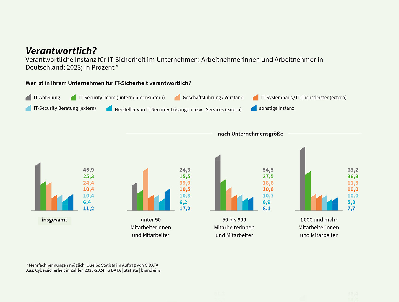 (pressebox) (Bochum, 08.02.2024) Ob kleine und mittelständische Unternehmen oder Konzerne: Nur bei 25 Prozent der deutschen Firmen übernimmt die Geschäftsleitung die Verantwortung für den Bereich IT-Sicherheit. Das belegt die repräsentative Studie „Cybersicherheit in Zahlen“ von der G DATA CyberDefense AG, Statista und brand eins. Cyberangriffe auf Firmen und Institutionen verursachen hohe Kosten und verdeutlichen den Stellenwert umfangreicher IT-Securitymaßnahmen. Mit der im Oktober 2024 in Kraft tretenden NIS-2-Richtlinie darf die Chefetage IT-Sicherheit nicht mehr delegieren.