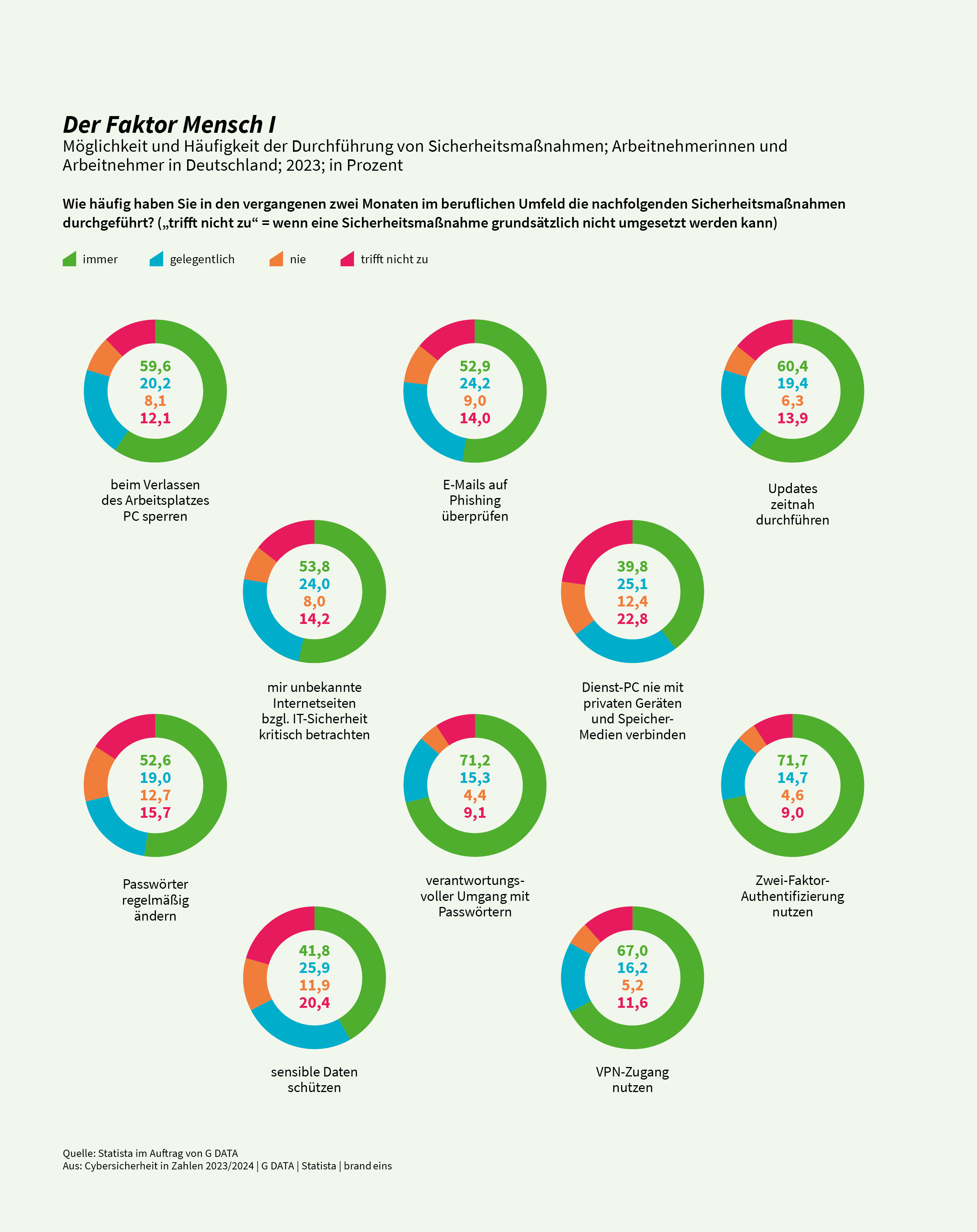 „Cybersicherheit in Zahlen“ zeichnet sich durch eine hohe Informationsdichte und besondere methodische Tiefe aus: Die Researcher und Marktforscher von Statista haben Zahlen, Daten und Fakten aus mehr als 300 Statistiken zu einem einzigartigen Gesamtwerk zusammengeführt. Mehr als 5.000 Arbeitnehmerinnen und Arbeitnehmer in Deutschland wurden im Rahmen einer repräsentativen Online-Studie zur Cybersicherheit im beruflichen und privaten Kontext befragt. Die Fachleute von Statista haben die Befragung eng begleitet und können dank einer Stichprobengröße, die weit über dem branchenüblichen Standard liegt, belastbare und valide Marktforschungsergebnisse im Heft „Cybersicherheit in Zahlen“ präsentieren.