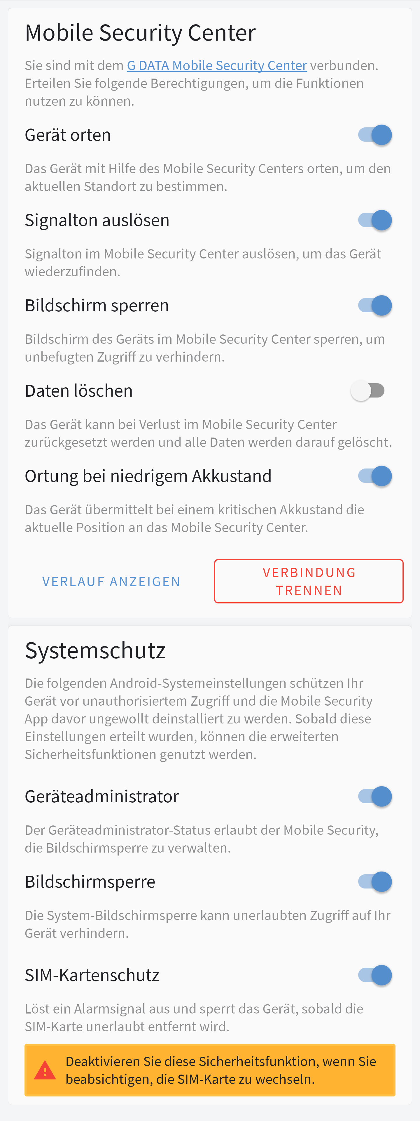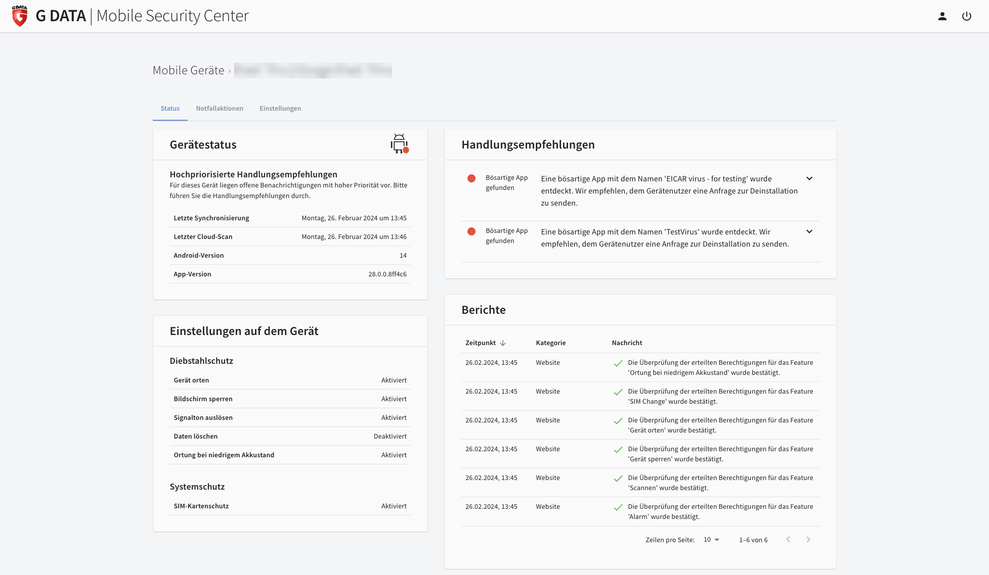 Zusätzlich erhalten Nutzerinnen und Nutzer in der Mobile-Security-Lösung Handlungsempfehlungen, um die Sicherheit ihres mobilen Gerätes zu verbessern. Tipps gibt es, wenn die Security-App Schadsoftware auf dem Smartphone findet, damit das Schadprogramm vollständig entfernt wird. Oder sie weist darauf hin, wenn sie etwa keinen Zugriff auf die Geräteadministration hat und somit im Notfall das Gerät nicht sperren oder die Daten löschen kann.