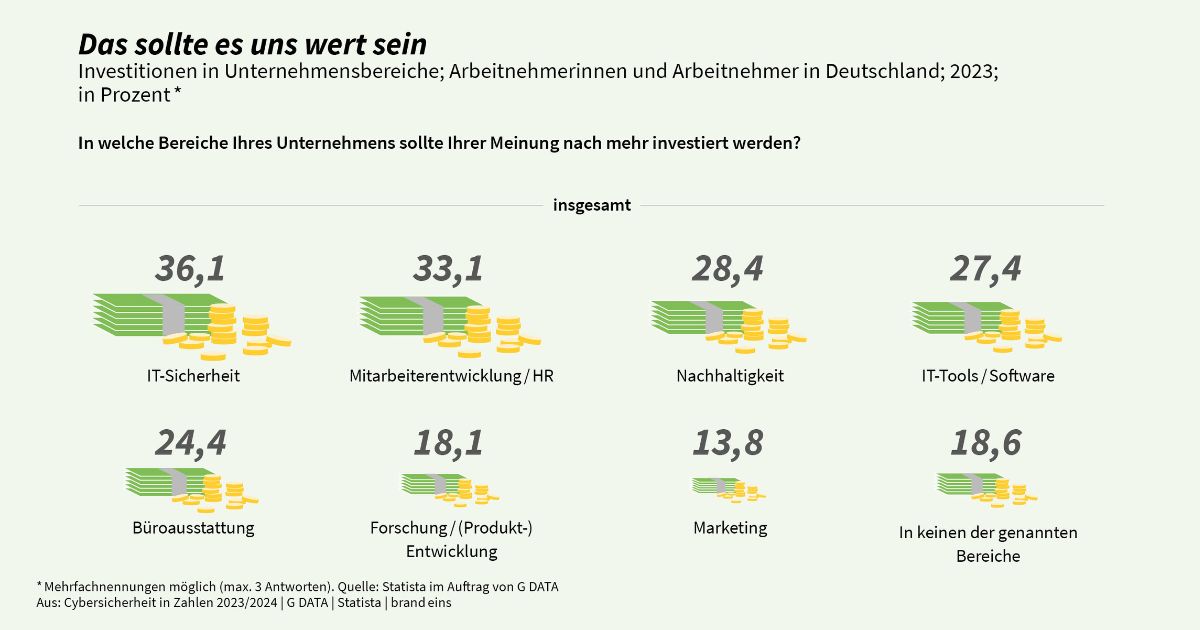 Regelmäßig ist in den Medien von Cyberattacken mit Ransomware auf Unternehmen zu lesen. Laut der repräsentativen Studie „Cybersicherheit in Zahlen“ von der G DATA CyberDefense AG, Statista und brand eins wünschen sich 36 Prozent der deutschen Arbeitnehmerinnen und Arbeitnehmer mehr IT-Sicherheit am Arbeitsplatz. Sie wählen den Bereich „IT-Sicherheit“ auf Platz eins der notwendigen Investitionen, die ihr Unternehmen erhöhen sollte. Viele Arbeitgeber stocken das IT-Budget aber nicht auf, da dies keinen unmittelbaren Profit generiert. Mehr Ausgaben für gemanagte Sicherheitslösungen, Security Awareness Trainings und Penetrationstests sind nicht nur Investitionen in eine ganzheitliche IT-Sicherheit, sondern auch eine strategische Notwendigkeit zum Schutz vor zunehmenden Cyberbedrohungen. Firmen punkten zusätzlich bei ihren Mitarbeitenden, wenn sie zeigen, dass sie das Thema sehr ernst nehmen.