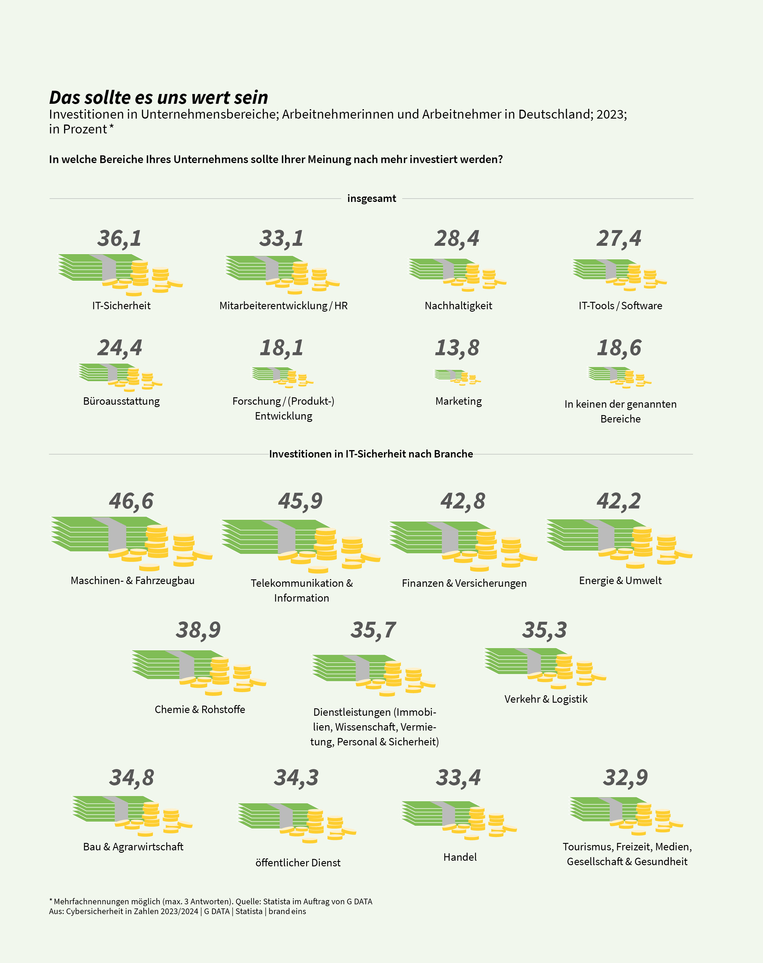 (pressebox) (Bochum, 07.03.2024) Mehr als ein Drittel der deutschen Angestellten finden höhere Ausgaben ihres Arbeitgebers in dem Bereich IT-Sicherheit notwendig. Das belegt die repräsentative Studie „Cybersicherheit in Zahlen“ von der G DATA CyberDefense AG, Statista und brand eins. Die Umfrage zeigt außerdem, in welchen Branchen die meisten Mitarbeitenden den Bedarf für mehr Investitionen in IT-Sicherheitsmaßnahmen sehen.