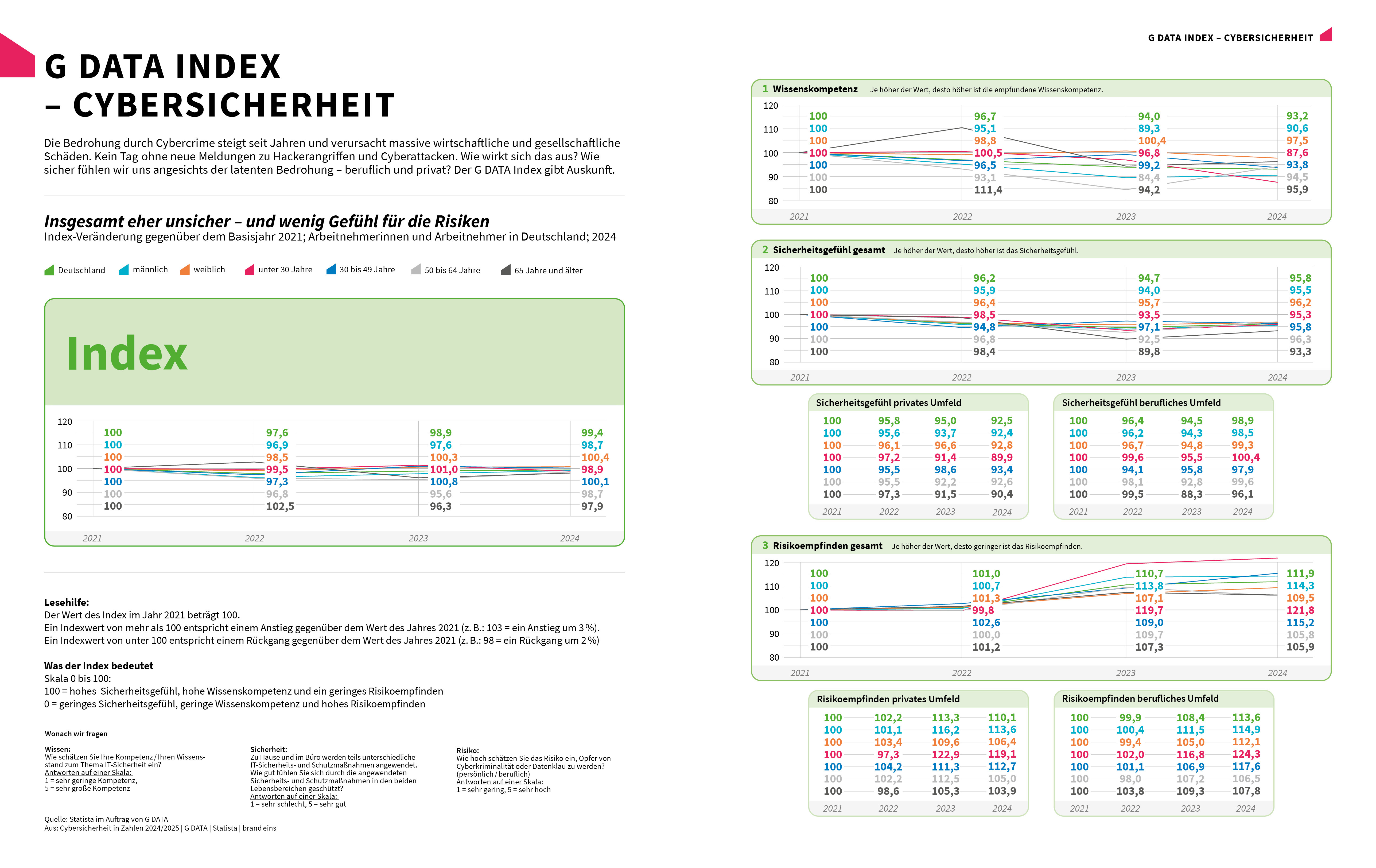 Der G DATA Index ist Teil der Studie „Cybersicherheit in Zahlen“, die bereits zum vierten Mal von der G DATA CyberDefense AG, brand eins und Statista veröffentlicht wurde. Die Studie bietet eine umfassende Analyse zur Cybersicherheit und basiert auf über 300 Statistiken. Der G DATA Index misst das Risikoempfinden, die Wissenskompetenz und das generelle Sicherheitsgefühl der deutschen Bevölkerung im Umgang mit Cyberbedrohungen. Für die repräsentative Online-Befragung wurden mehr als 5.000 Arbeitnehmerinnen und Arbeitnehmer in Deutschland im beruflichen und privaten Kontext befragt. Die Datenerhebung wurde von den Marktforschern von Statista begleitet, wobei die große Stichprobe überdurchschnittlich belastbare und valide Ergebnisse gewährleistet.