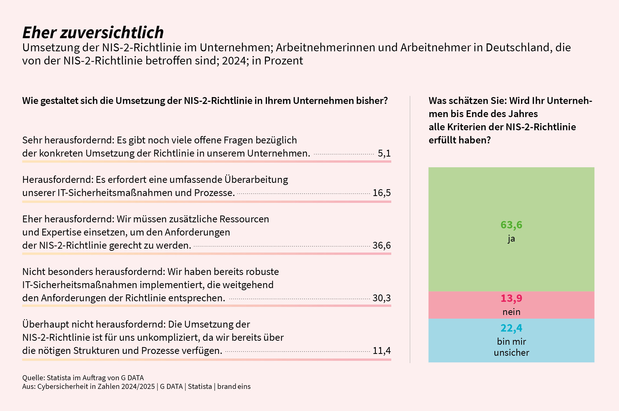 (pressebox) (Bochum, 14.11.2024) Die Anforderungen der kürzlich in Kraft getretenen NIS-2-Direktive zur Cybersicherheit setzen viele Unternehmen unter Druck. Drei von fünf Arbeitnehmerinnen und Arbeitnehmer von betroffenen Firmen in Deutschland sind aber optimistisch. Sie glauben, dass ihr Unternehmen alle Vorgaben bis Jahresende erfüllt. Das belegt die repräsentative Studie „Cybersicherheit in Zahlen“ von der G DATA CyberDefense AG, Statista und brand eins. Dieser Optimismus birgt jedoch eine Gefahr: Der tatsächliche Aufwand für Maßnahmen wird unterschätzt.