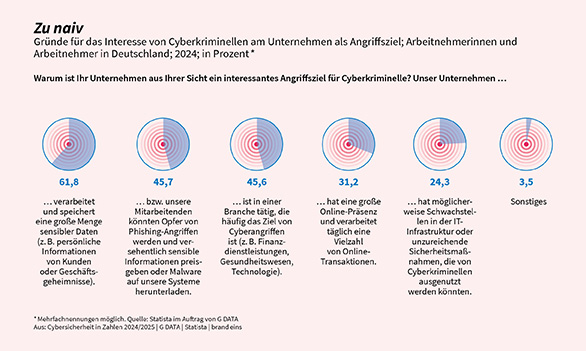 (pressebox) (Bochum, 22.05.2025) Die Mehrheit der deutschen Arbeitnehmenden (fast 62 Prozent) denkt, dass Cyberkriminelle ihr Unternehmen gezielt angreifen, weil sie viele kritische Daten wie Kundeninformationen verarbeiten. Das ist ein Ergebnis der repräsentativen Studie „Cybersicherheit in Zahlen“ von G DATA CyberDefense, Statista und Brand eins. Grundsätzlich ist jede Firma ein interessantes Angriffsziel – unabhängig von Konstruktionsplänen oder anderer Daten. Täter setzen vielmehr auf Massenangriffe mit Systemverschlüsselung und Erpressung. Das Resultat zeigt, dass in Unternehmen noch viel Aufklärungsarbeit in der Belegschaft geleistet werden muss.