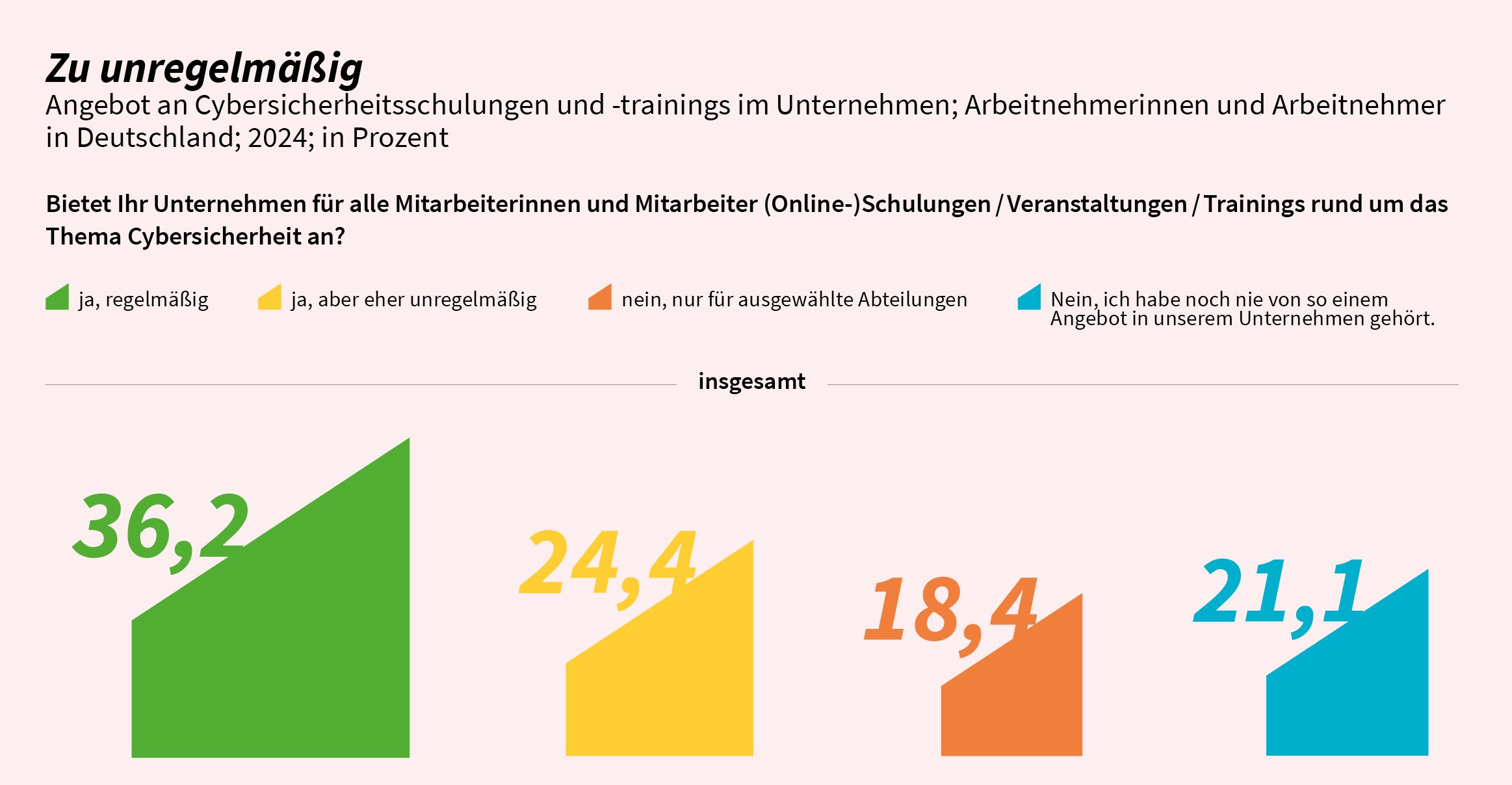 Die Studie zeigt auch: Je größer das Unternehmen, desto eher gibt es regelmäßige Trainings. In Organisationen mit über 1.000 Beschäftigten erhalten mehr als 43 Prozent der Mitarbeitenden regelmäßig Schulungen. In kleineren Unternehmen mit 100 bis 249 Mitarbeitenden berichtet nur jeder vierte Befragte von wiederkehrenden Trainings.