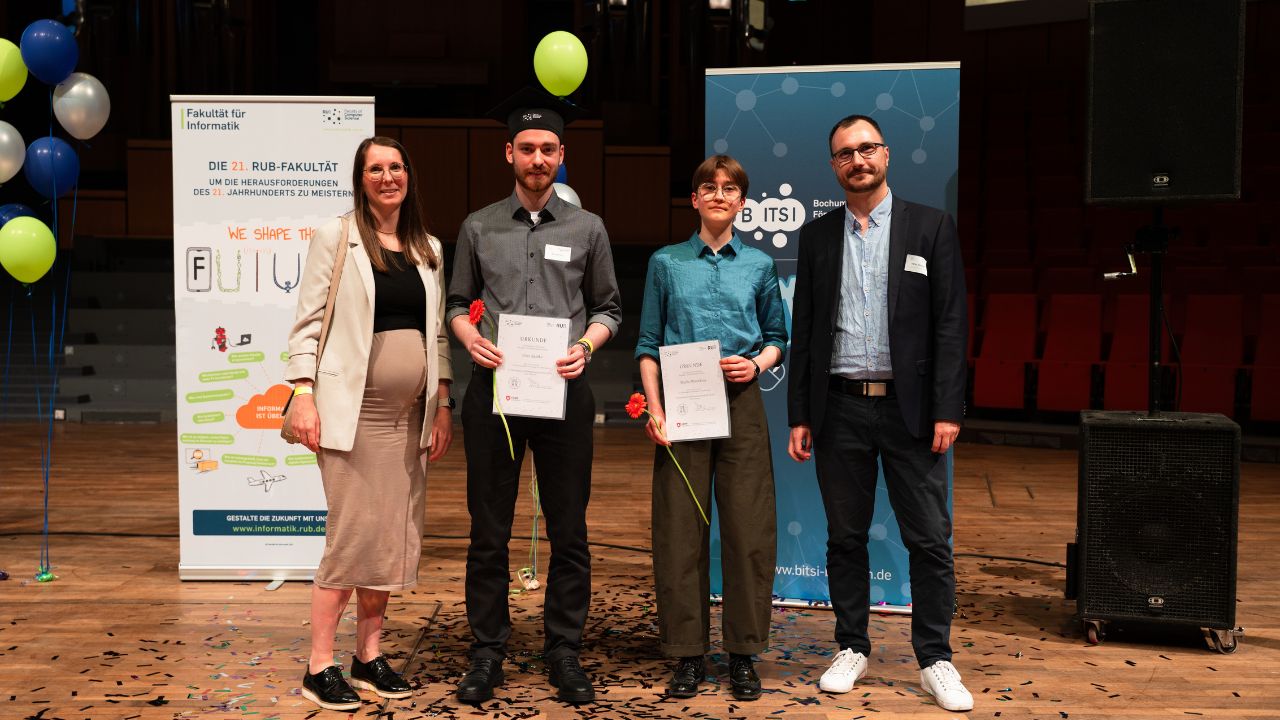 (pressebox) (Bochum, 06.08.2025) Im Juli 2025 ehrte G DATA CyberDefense erneut zwei herausragende Absolventinnen und Absolventen des Bachelorstudiengangs IT-Sicherheit an der Ruhr-Universität Bochum (RUB). Mit einem Preisgeld über je 500 Euro wurden sie für die besten Abschlüsse an der Fakultät für Informatik ausgezeichnet. Ergänzend dazu vergab G DATA auch in diesem Jahr wieder zwei Deutschlandstipendien an der RUB für den Studiengang IT-Sicherheit.Vielversprechende Talente frühzeitig zu fördern und langfristig für Cybersicherheit zu begeistern, das liegt G DATA am Herzen. Im Rahmen der akademischen Jahresfeier der Fakultät für Informatik an der RUB zeichnete der Cyber-Defense-Spezialist im Juli 2025 die besten Absolventinnen und Absolventen des Bachelorstudiengangs IT-Sicherheit aus. Elias Radtke und Mariia Mutovkina erhielten für ihre herausragenden Studienleistungen jeweils den G DATA Preis über 500 Euro. Die Preisverleihung erfolgte vor Ort durch Sonja Tietz (Human Ressources bei G DATA CyberDefense) und Stefan Hausotte (Head of Threat Intelligence & Infrastructure bei G DATA CyberDefense). Im Anschluss an die Verleihungen und Übergabe der Urkunden bot der feierliche Rahmen Gelegenheit zum Austausch mit den Förderern.