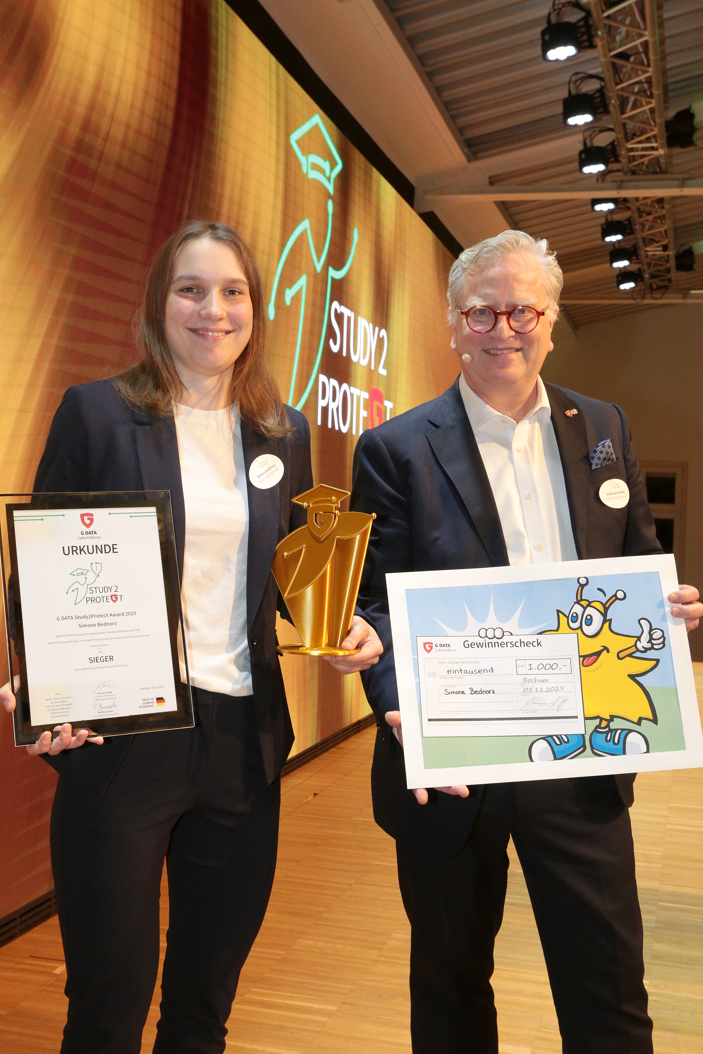 (pressebox) (Bochum, 06.11.2025) Der G DATA Study2Protect Award wurde am 5. November 2025 zum zweiten Mal auf dem G DATA Campus in Bochum verliehen. Mit ihrer Abschlussarbeit beeindruckte Simone Bednorz die Jury und wurde mit dem 1.000 Euro dotierten Preis ausgezeichnet. Der Award würdigt herausragende Bachelor- und Masterarbeiten in den Bereichen IT-Sicherheit, Cyberdefense und Resilienz im DACH-Raum. Fünf Finalistinnen und Finalisten präsentierten ihre Forschungsarbeiten vor einer unabhängigen fünfköpfigen Fachjury aus Wissenschaft, Wirtschaft, Behörden und Verbänden sowie rund 100 Gästen.Simone Bednorz hat am 5. November 2025 für ihre herausragende Forschungsarbeit den G DATA Study2Protect Award und 1.000 Euro Preisgeld erhalten. Vor 100 Gästen präsentierte sie ihre Masterarbeit mit dem Titel „Identifizierung und Analyse von Angreifer Vorgehensweisen basierend auf kompromittierten Cloud-Benutzern“. Dabei überzeugte sie die Fachjury, bestehend aus fünf Expertinnen und Experten aus Wissenschaft, Wirtschaft, Behörden und Verbänden, durch besondere wissenschaftliche Qualität und praxisnahe Innovation.