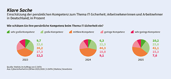 (pressebox) (Bochum, 04.12.2025) Regulatorik wirkt sich positiv auf die Cybersicherheit von Unternehmen aus. Das ist ein Ergebnis der repräsentativen Studie „Cybersicherheit in Zahlen“ von der G DATA CyberDefense AG, Statista und brand eins. 36 Prozent der Belegschaften in deutschen Firmen attestiert sich eine gute oder sehr gute Security-Kompetenz. Im Vergleich zum Vorjahr stieg der Anteil, aber trotzdem ist noch viel Luft nach oben. Damit einhergehend ist die Hälfte der Arbeitnehmenden davon überzeugt, dass das Risiko gering ist, ein Opfer von Cyberkriminalität zu werden. Für IT-Verantwortliche heißt es jetzt am Ball zu bleiben auf dem Weg zu einem resilienten Unternehmen.