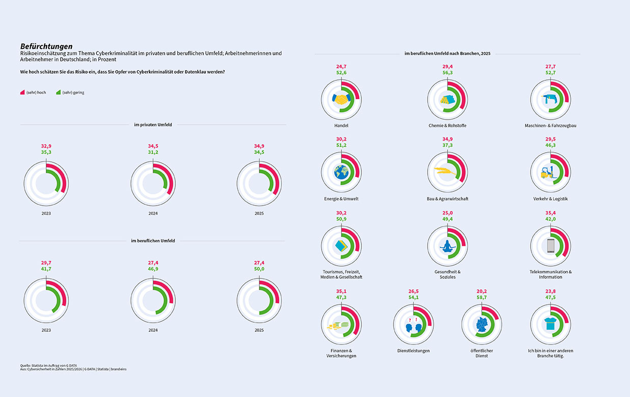Trotz der steigenden Security-Kompetenz zeigen die Ergebnisse aus „Cybersicherheit in Zahlen“ ein eher geringes Empfinden für die Risiken durch Cyberkriminalität und Datendiebstahl. Nur etwas mehr als ein Viertel (27 Prozent) der Befragten glaubt an eine hohe oder sehr hohe Gefahr, dass ihr Unternehmen einer Cyberattacke zum Opfer fällt. Im Branchenvergleich fällt der Wert im öffentlichen Dienst mit 20 Prozent am geringsten aus. Deutlich wird hier ein großer Handlungsdruck, denn generell sind alle Unternehmen und Institutionen für Cyberkriminelle interessante Angriffsziele. Am sensibelsten sind die Mitarbeitenden aus den beiden Bereichen „Telekommunikation und Information“ und „Finanzen und Versicherungen“. Gerade diese Branchen sind stark durch Verordnungen reguliert.