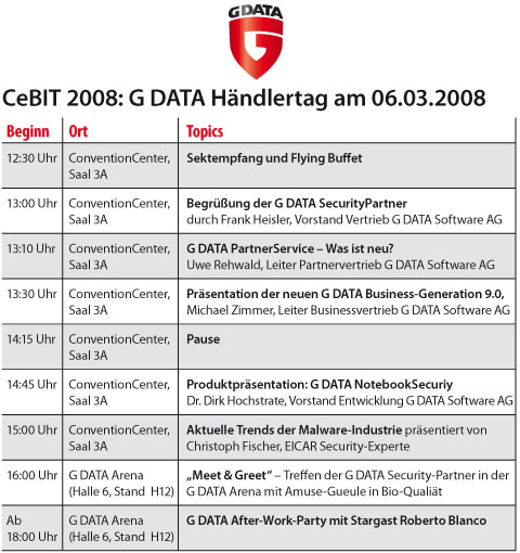 (pressebox) (Bochum, 20.02.2008) Auf der CeBIT 2008 (4. bis 9. März) veranstaltet G DATA seinen traditionellen Händlertag. Am Donnerstag, 6. März 2008 ab 13 Uhr im Convention Center, Saal 3 A stellt der Security-Spezialist seine neuen Lösungen dort exklusiv den Handelspartnern vor.