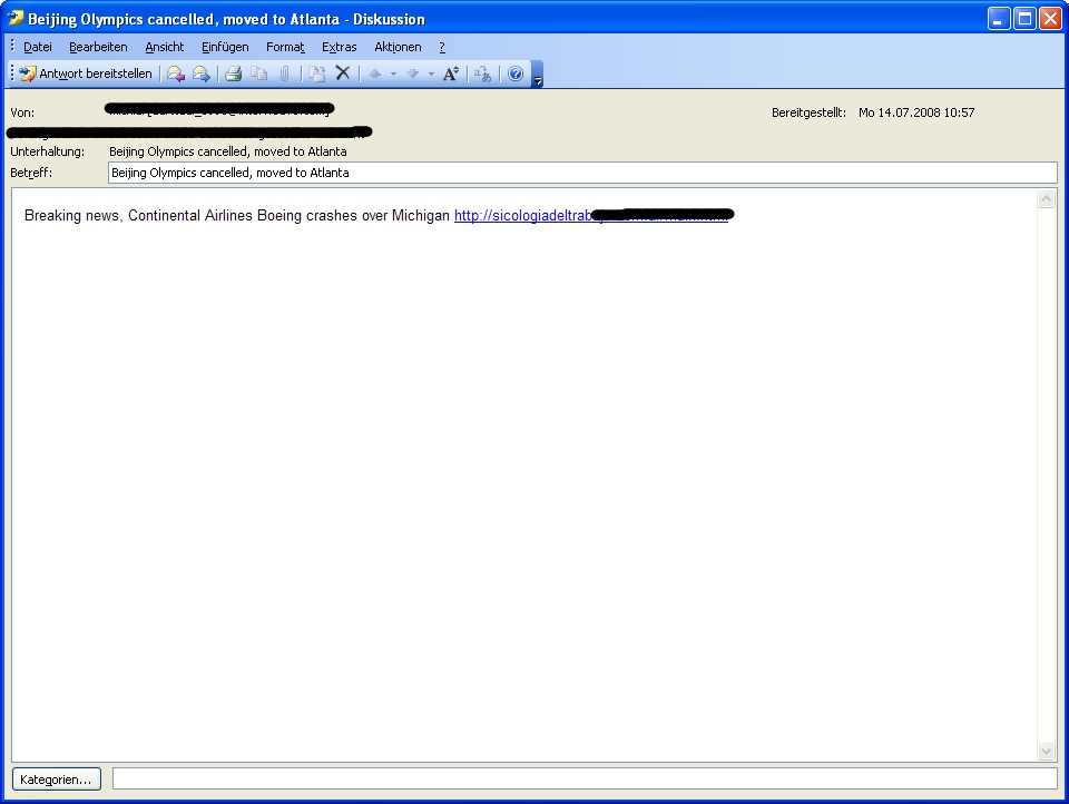 Olympiade - Doping für Online-Kriminelle Die Olympiade in Peking könnte sich für Online-Kriminelle als besonders lohnenswerter Mega-Event erweisen. Nach Einschätzung des G DATA Security Labs ist von einem verstärkten Aufkommen gezielter Oympia-Spam und Phishing-Mails kurz vor und auch während der Spiele auszugehen. Mögliche Themen: Angebliche Doping-Fälle, vermeintliche Enthüllungs-Videos oder Angebote von Karten-Kontingenten. Erste Fälle von "Breaking News-Spam" mit Olympia-Bezug und Links auf infizierte Webseiten sind bereits aufgetreten.