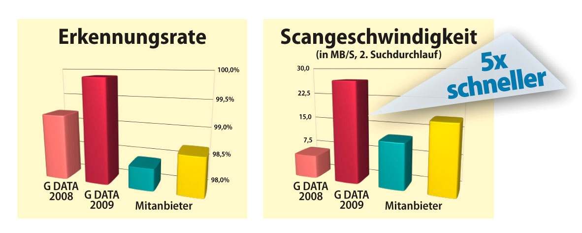 Die von AV-Test gemessene Scangeschwindigkeit von G DATA InternetSecurity 2009 ist im Vergleich zum Vorgänger bis zu 5mal schneller und liegt damit erstmals in der Spitzengruppe des Testfeldes (s. Infografik).