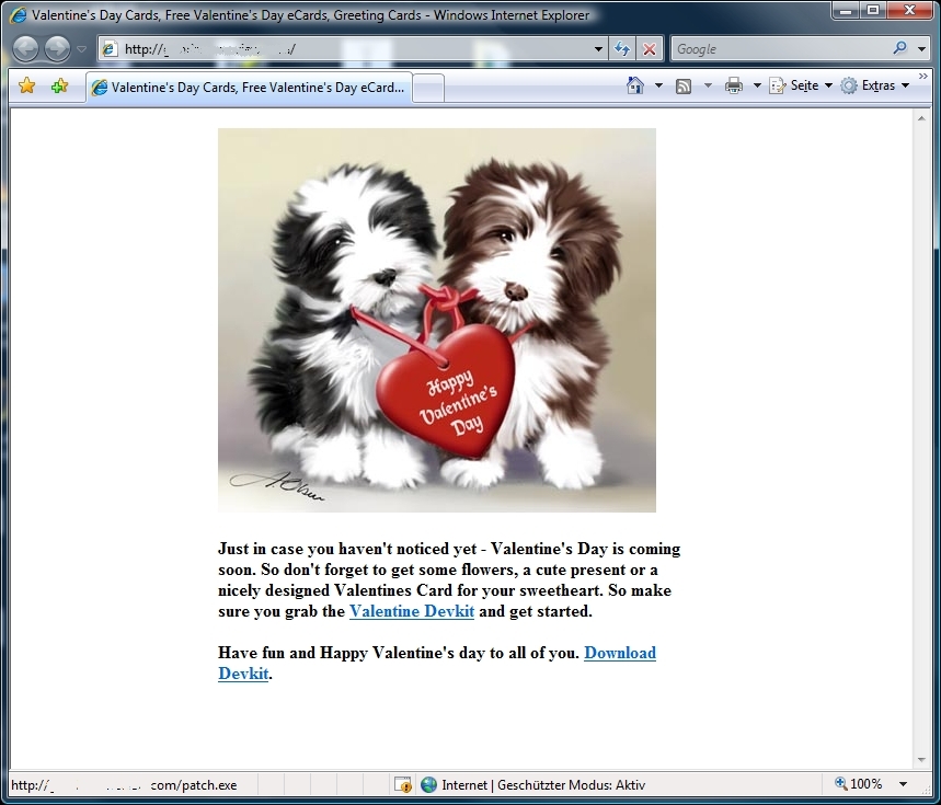 Die Erfahrung aus dem Vorjahr belegt, dass es Cyber-Gangstern immer wieder gelingt, internationale Großereignisse für ihre Kampagnen auszuschlachten. Bereits 2008 hatte die damals hochgradig aktive Storm-Botnetz-Bande reiche Beute durch die Verbreitung von Valentinstags-Malware gemacht. Obwohl „Storm“ bereits Geschichte ist, stehen seine Nachfolger bereits in den Startlöchern. Konkrete Fälle mit aktueller Valentinstags-Malware liegen den Experten der G DATA Security Labs vor.