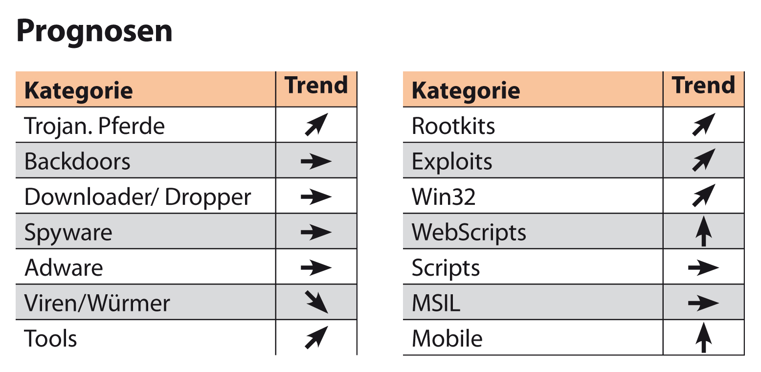 Daher werden Spam und Spyware auch weiterhin die Kassen der Schreiber, Verbreiter und Nutzer von Malware füllen. Daran werden auch gelegentliche Erfolge der Ermittlungsbehörden nichts ändern. Nach wie vor stehen dabei die Nutzer von Windows-Betriebssystemen im Blickpunkt der Angreifer, auch wenn die Anzahl der Schädlinge für Apple, Unix- oder Mobilrechner in nächster Zeit steigen wird.