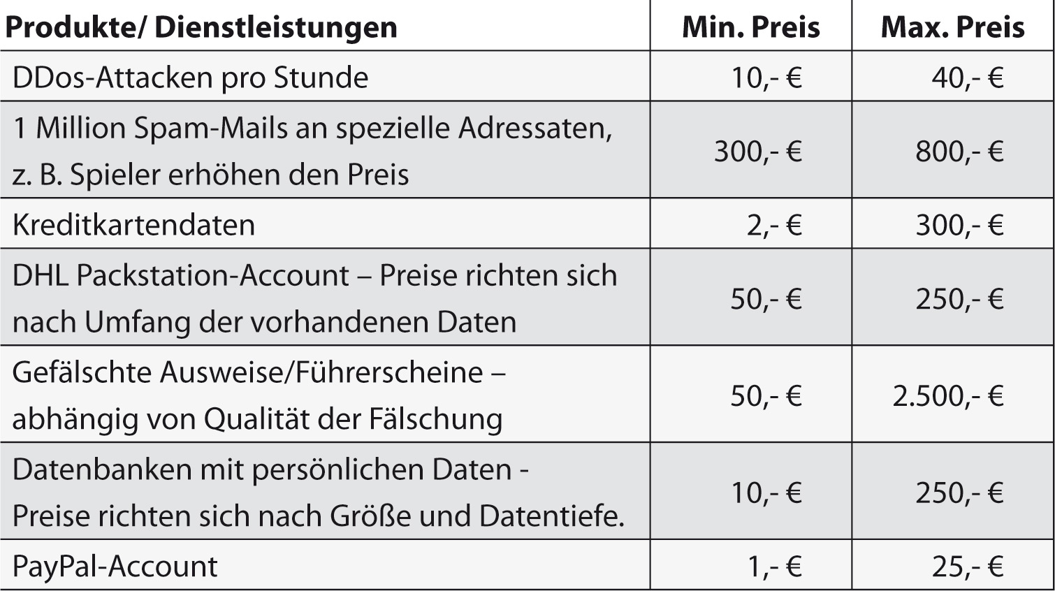 Das Waren- und Dienstleistungsangebot der sog. „Black Markets“ ist riesig und umfasst Service-Leistungen, wie Rechner-Infektionen, Botnetz-Vermietungen oder Cyber-Attacken auf Konkurrenten oder Unternehmen. Brot und Milch der Szene sind DDos-Attacken, Spam-Versand, Handel gestohlener Kreditkarteninformationen mit Qualitätssiegel oder Hardware für angehende Bankbetrüger.