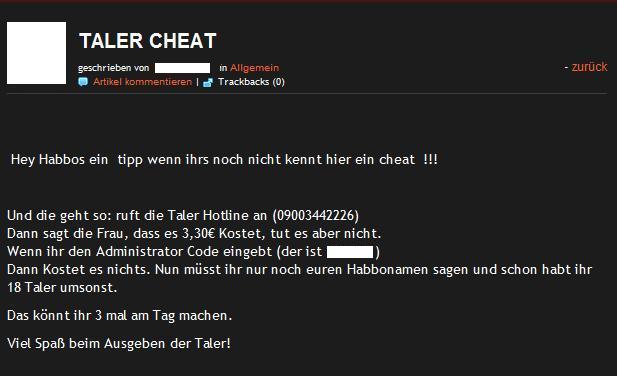 In Deutschland kursiert noch eine weitere, besonders hinterhältige Masche, auf die Kinder mit großer Wahrscheinlichkeit hereinfallen könnten. Habbo Taler können generell bei den echten Betreibern per kostenpflichtigen Telefonanruf erworben werden. Die Gebühr beträgt 3,30 Euro pro Anruf für 18 Habbo Taler. Man benötigt als Legitimierung eine Habbo ID, welche für jeden Spieler individuell angelegt wird und damit einmalig ist. Als Trittbrettfahrer nutzen Online-Kriminelle dieses Bezahlverfahren. Die Masche: Betrüger erstellen einen einfachen Blog und locken Habbo Spieler mit scheinbar kostenlosen Talern. Der Blogsschreiber gibt seine eigene Habbo ID als Administrator Code aus. Der Administrator Code macht angeblich den Anruf und damit den Erwerb der Taler kostenlos. Durch die Angabe des Administrator Codes werden jedoch die gekauften Habbo Taler dem Konto des Betrügers gutgeschrieben und nicht den eigentlichen Käufer.