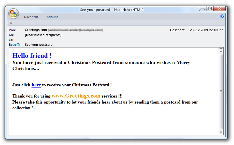 (pressebox) (Bochum, 11.12.2009) Weihnachtsgrüße an Freunde und Bekannte per Grußkarte oder E-Mail zu versenden, wird von Jahr zu Jahr immer beliebter. Die jährlichen Feiertage sind aber auch in den Business-Kalendern der Spam-Versender fest eingetragen. G Data rechnet daher in den kommenden Wochen mit einer deutlichen Zunahme von Spam mit Weihnachts- und Neujahrsbezug. Die Täter nutzen dabei gefälschte E-Cards und modifizierte E-Card Seiten zur Verbreitung von Computerschädlingen, um so die Rechner der Empfänger mit Schadcode zu infizieren und sie unter ihre Kontrolle zu bringen.