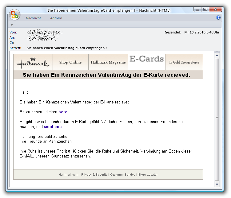 - Szenario 2: Die Grußkarte kommt angeblich als Anhang Der Empfänger soll die Datei, meistens eine .exe oder ein gepacktes Archiv, öffnen, um die eCard zu sehen. Sobald die Datei ausgeführt wird, greift Malware den Rechner an und die Gefahr ist groß, dass die Angreifer beispielsweise die Kontrolle über den Computer erhalten, Daten ausspionieren, ihn in ein Botnetz einbinden und für kriminelle Machenschaften benutzen.