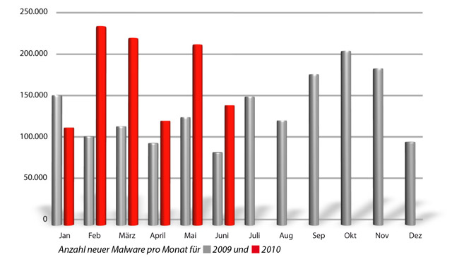 Mit 1.017.208 neuen Schädlingen zählten die G Data Experten für das erste Halbjahr 2010 mehr neue Computerschädlinge, als jemals in einem vergleichbaren Zeitraum zuvor. Schon jetzt sind fast zwei Drittel der Gesamtsumme des letzten Jahres erreicht.